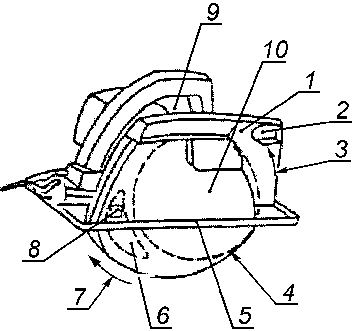 1 - контрольная точка; 2 - рукоятка; 3 - пильный диск