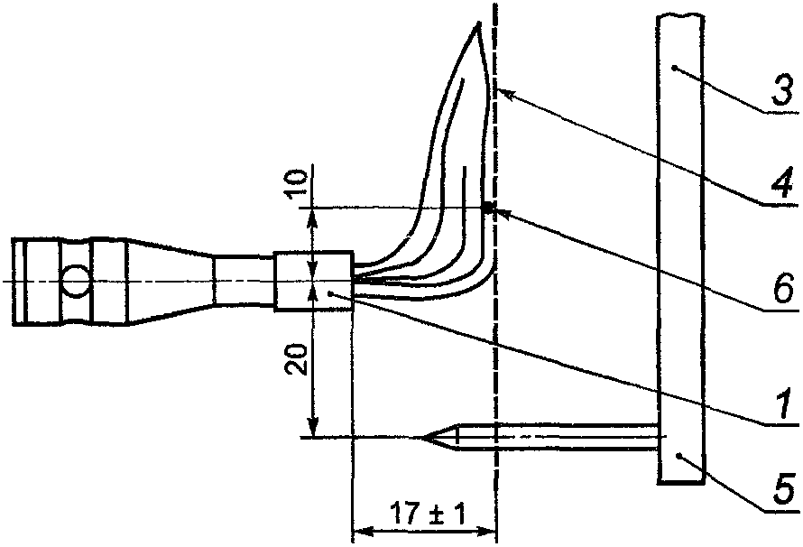 На поверхность или нижнюю кромку образцов текстильных материалов, находящихся в вертикальном положении, воздействуют пламенем с заданными характеристиками из соответствующей горелки в течение 10 с.