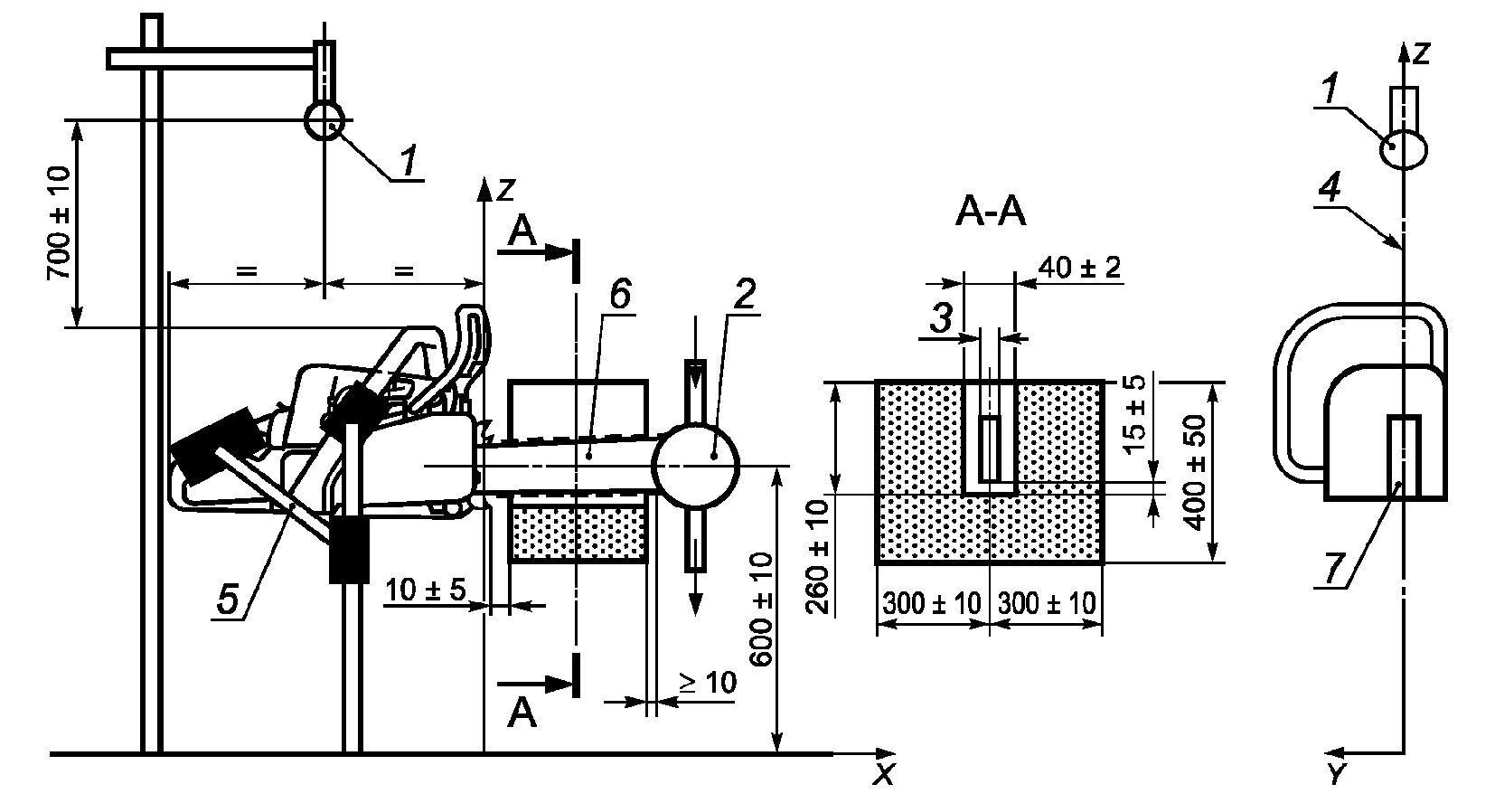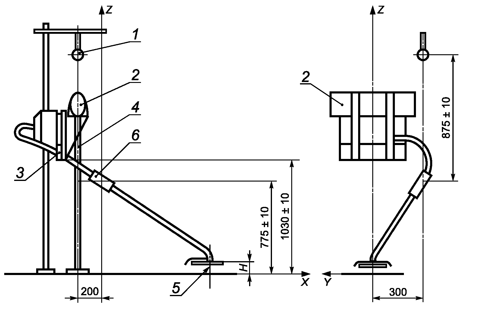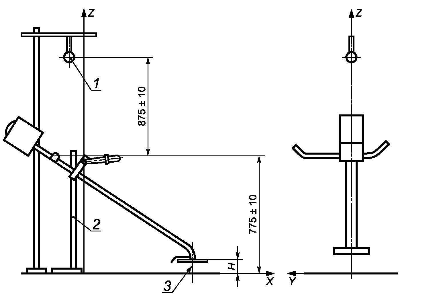 Устанавливают машину в устройстве крепления так, чтобы петля подвески была на высоте (775 +/- 10) мм над землей (рисунок B.1). Дисковое полотно кустореза должно быть на высоте H = (300 +/- 10) мм над землей, плоскость вращения режущего инструмента мотокосы (ножа или струны) - на высоте (50 +/- 25) мм. Если петля подвески регулируемая, то ее положение выбирают так, чтобы выдержать размер H в требуемых пределах.