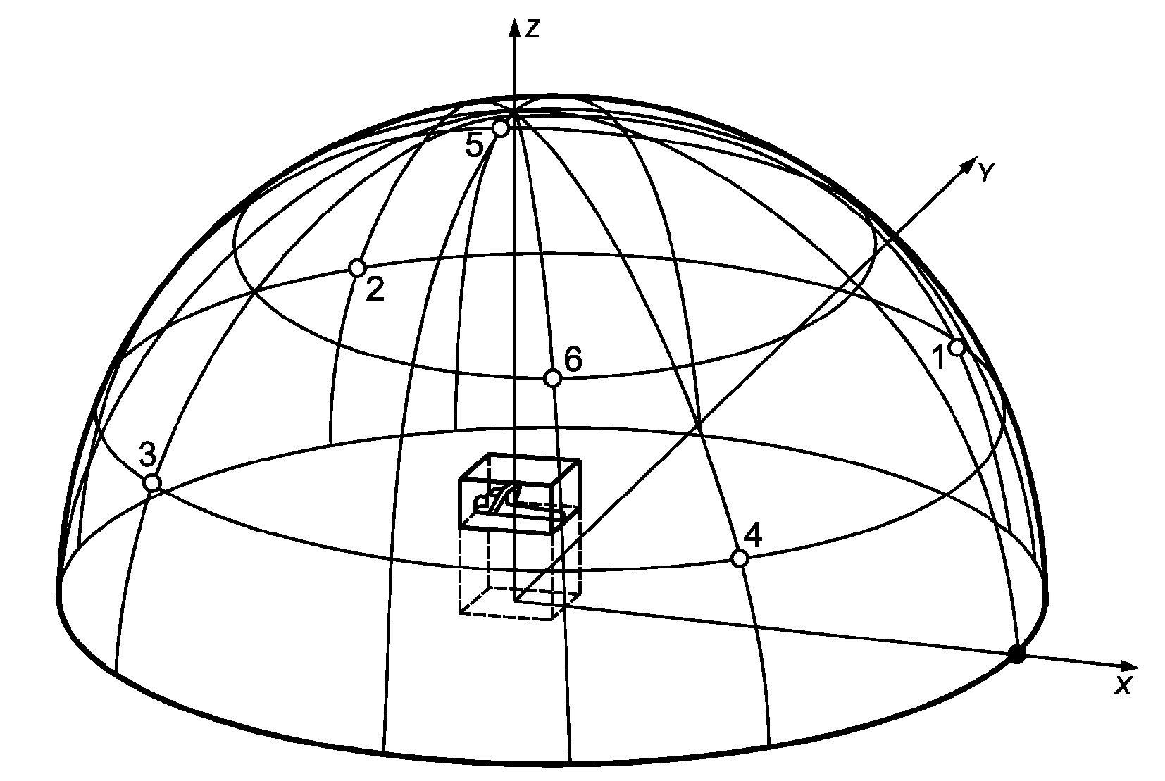 Точки измерений 5 и 6 согласно настоящему стандарту имеют координату по оси X, равную 0,28r, в то время как по директиве - 0,27r. При полусфере r = 4 м отличие координат незначительное (1,12 и 1,08 м соответственно). Поэтому измеренные по настоящему стандарту значения лишь несколько меньше, чем измеренные по директиве значения.