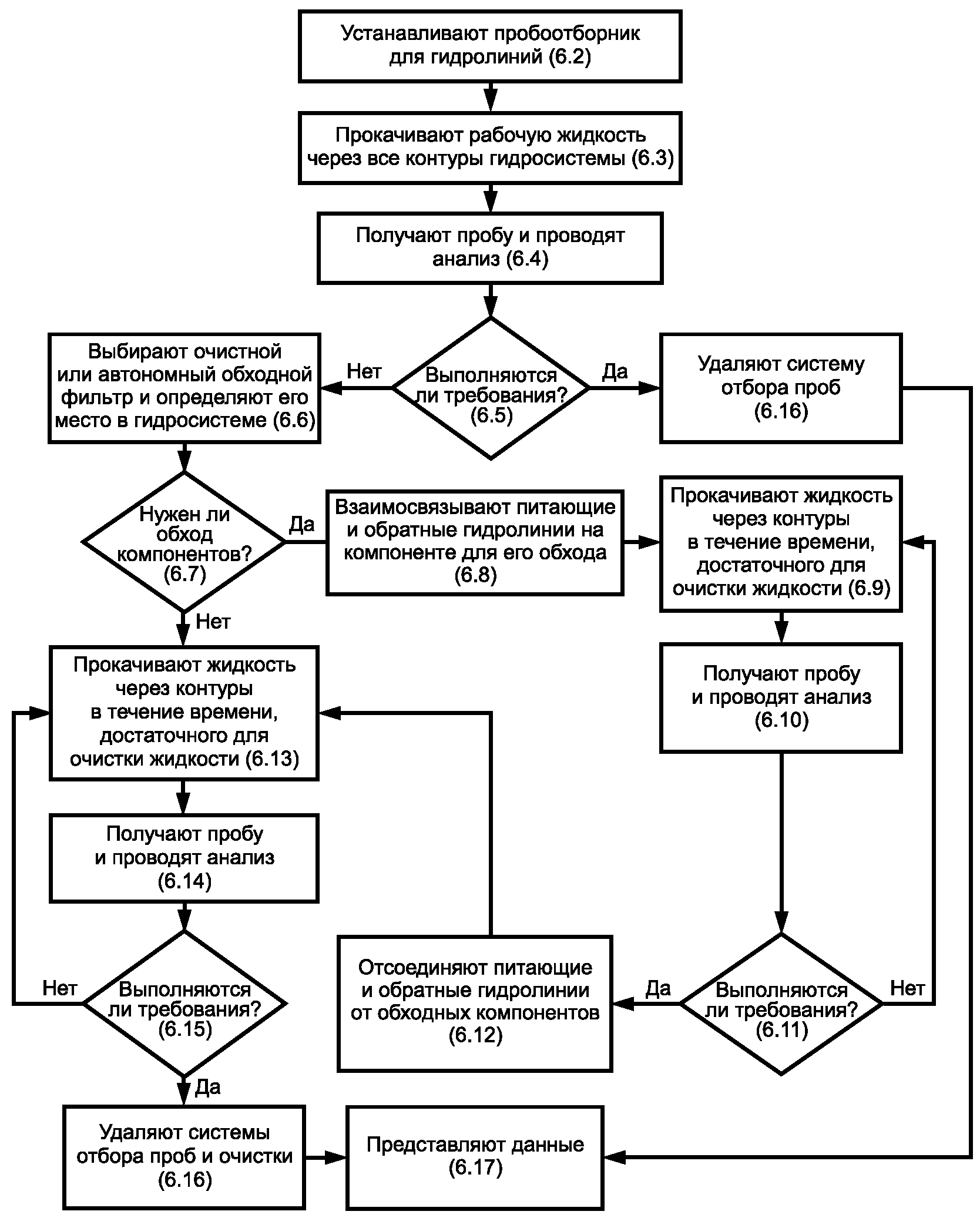 рисунке 1 представлена блок-схема, отражающая методику оценивания чистоты собранной гидросистемы и номера пунктов настоящего стандарта, соответствующих каждому этапу процедуры.