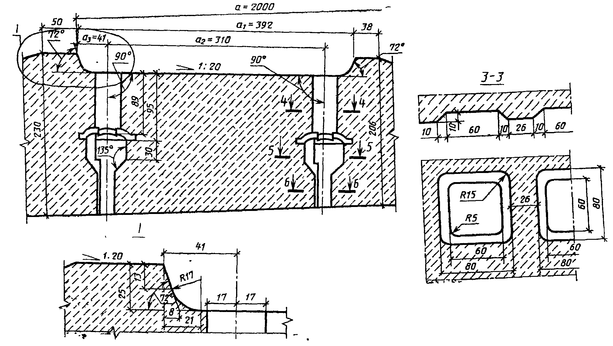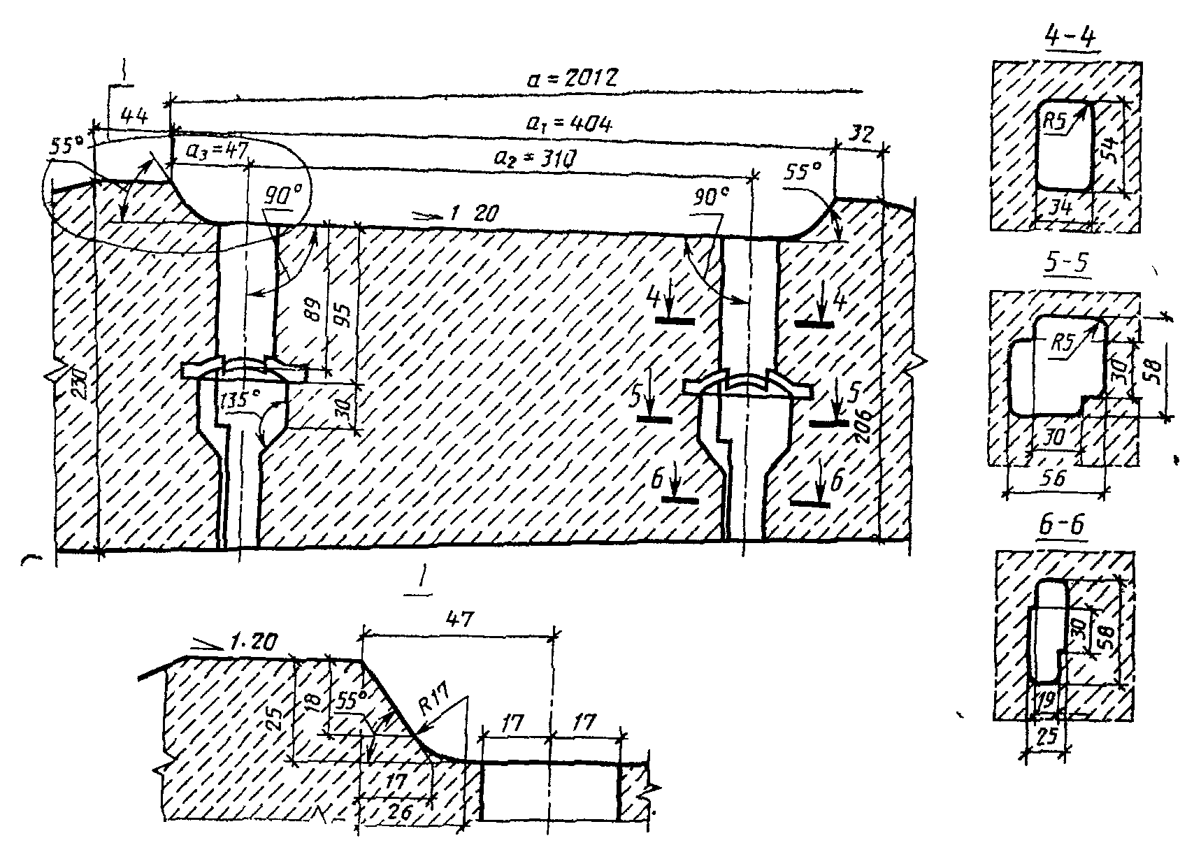 черт. 1, а форма и размеры вертикальных каналов для закладных болтов отличаются от указанных на