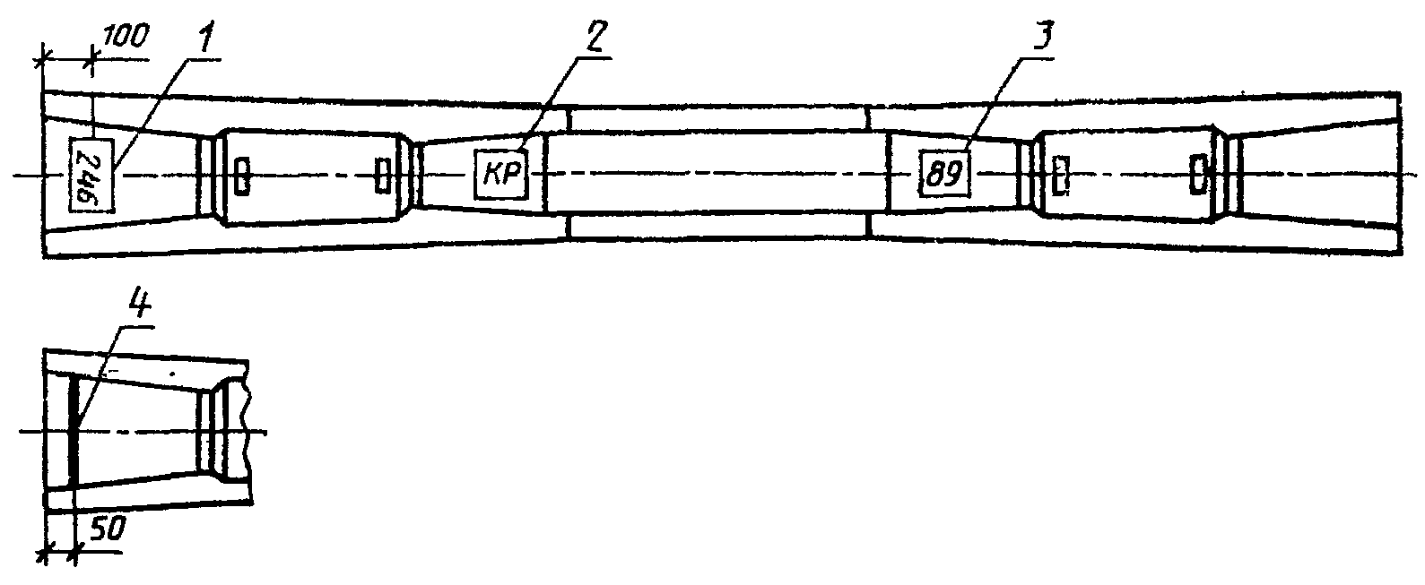 Примечания. 1. На кромках, примыкающих к подошве и торцам шпалы, допускаются фаски шириной не более 15 мм.