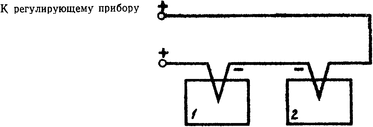 блок поддержания и измерения температурных перепадов (чертеж), состоящий из двух термопреобразователей типа ТХА по ГОСТ 6616-74, соединенных дифференциально с выводом средней точки, и регулирующего прибора типа КСП-3, к которому они подключены, минуя компенсационное устройство (все знаки полярности могут быть заменены на противоположные);