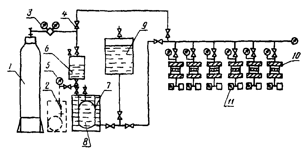 3.2.3. Перед началом испытания образцы должны быть проверены на герметизацию и дефектность путем оценки характера фильтрации инертного газа, подаваемого при избыточном давлении 0,1 - 0,3 МПа к нижнему торцу образца, на верхний торец которого налит слой воды.