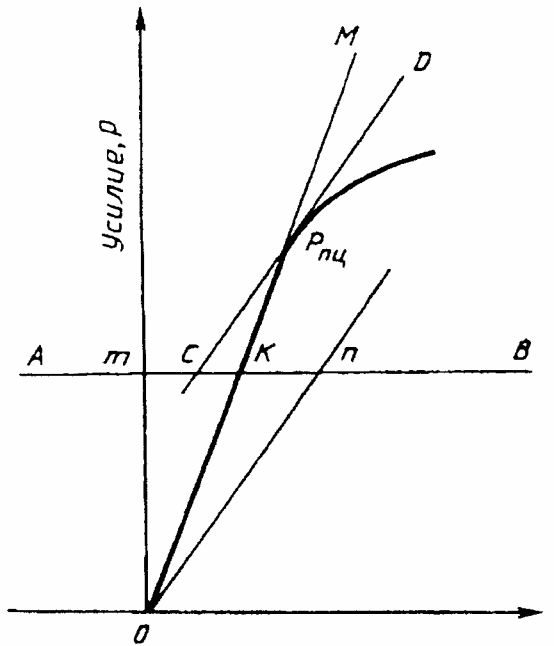 Допуск на увеличение тангенса угла, образованного касательной к кривой деформации с осью усилий - 50% от его значения на линейном участке.