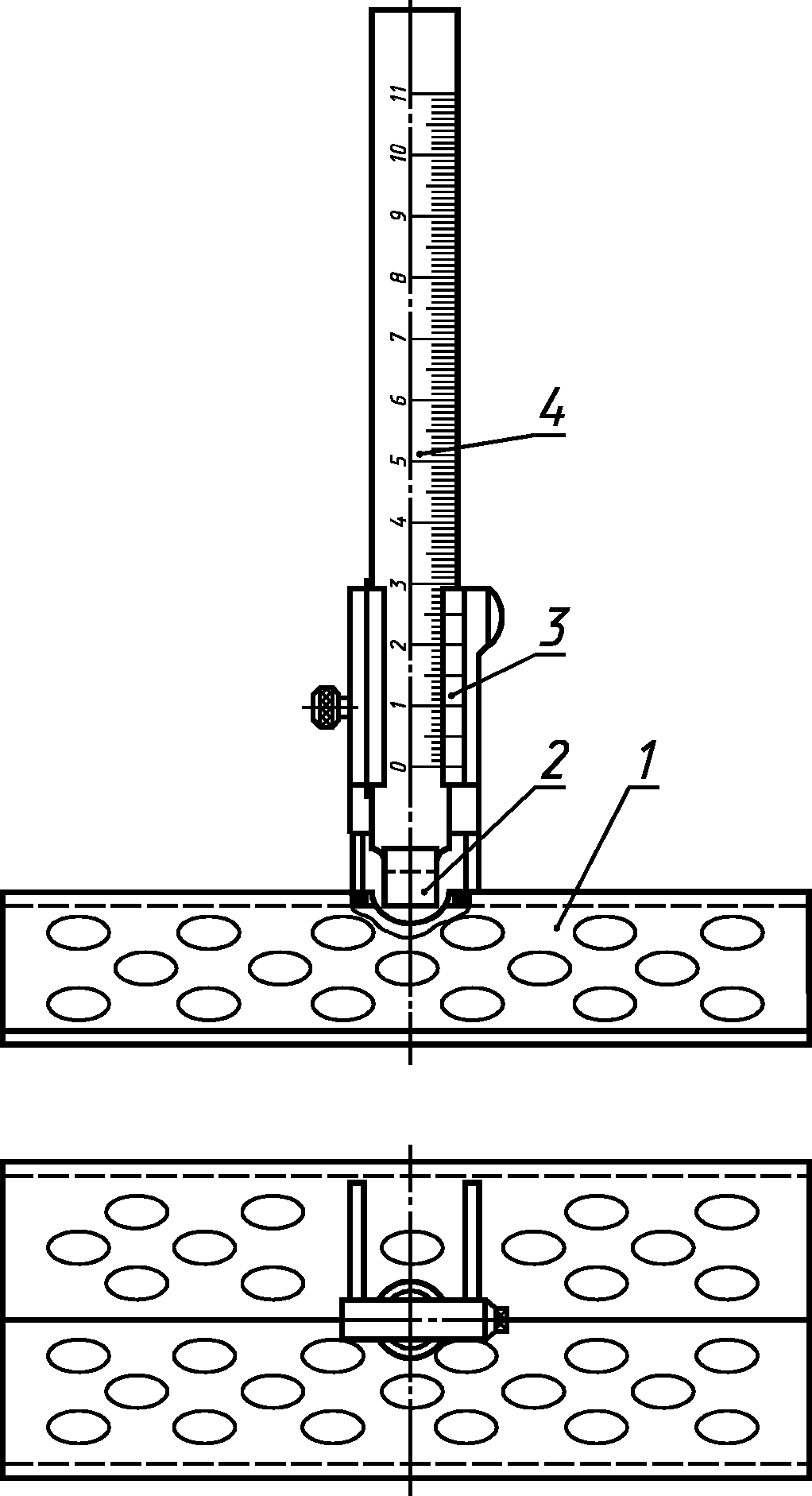 3.1.5. При измерении глубины отбитости кромок изделий, имеющих форму тел вращения, опорный фиксатор выводят из прорезей платы, приспособление плотно прикладывают к поврежденной кромке изделия так, чтобы базовая плата была прижата к цилиндрической поверхности, при этом вертикальная ось симметрии платы должна совпадать с образующей этой поверхности.
