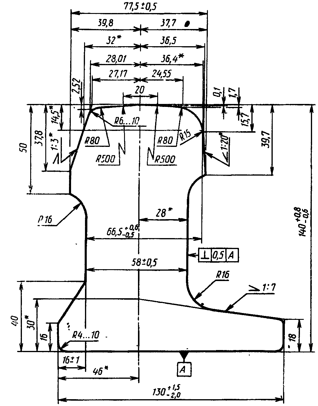 <*> Теоретическая масса рельса определена, исходя из номинальных размеров поперечного сечения рельсов и плотности стали 7830 кг/м3.