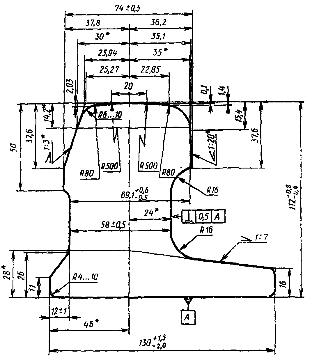 4. Размеры с неуказанными предельными отклонениями обеспечивают инструментом и в готовых рельсах не контролируют.