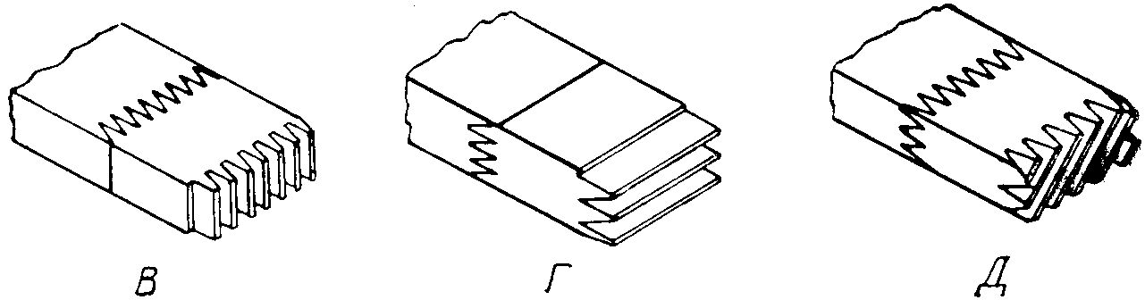 1.2. Зубчатые клеевые соединения в зависимости от расположения шипов по отношению к пласти склеиваемых заготовок разделяют на три вида: В - вертикальное, Г - горизонтальное, Д - диагональное (черт. 2).