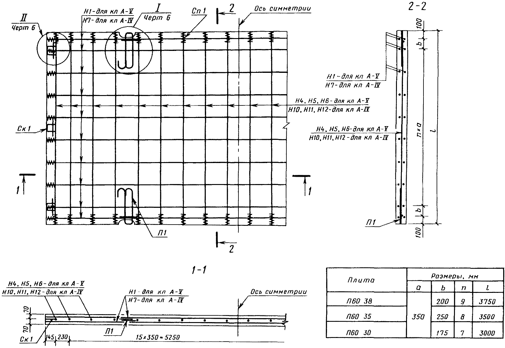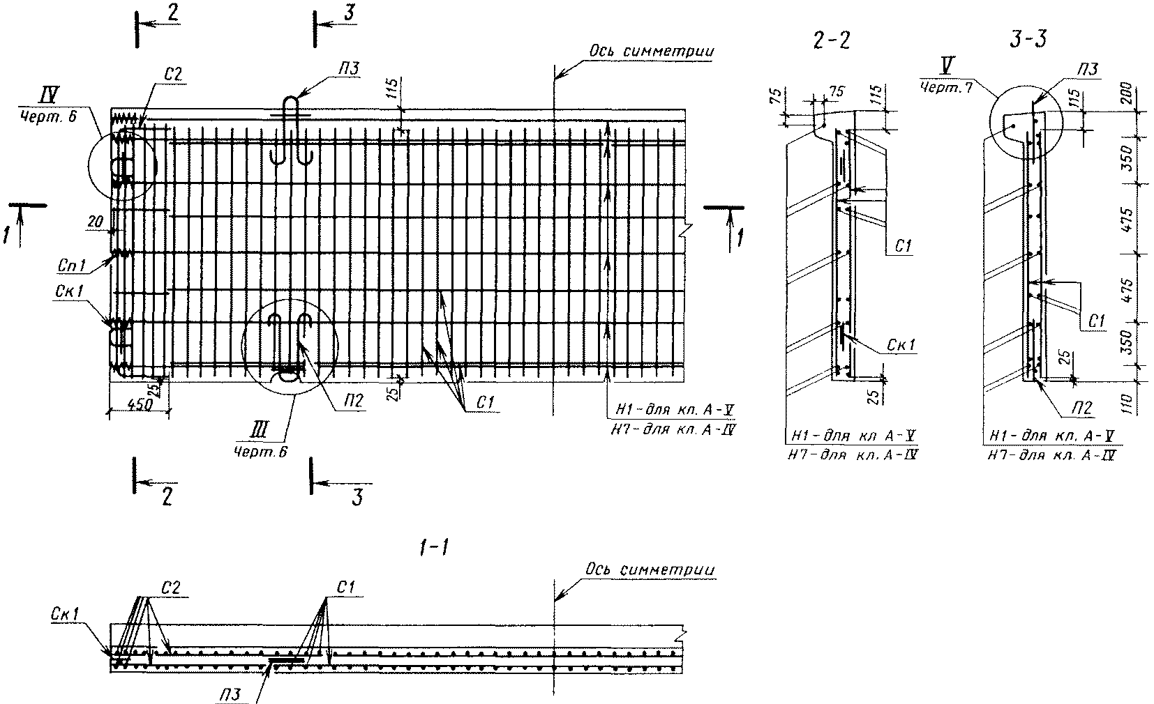 Примечание. Расход напрягаемой арматуры и общий расход арматуры на плиту приведен для условной длины стержней, равной длине плиты, и уточняется с учетом действительной длины напрягаемой арматуры, принимаемой в зависимости от способа натяжения арматуры и конструкции захватных устройств.