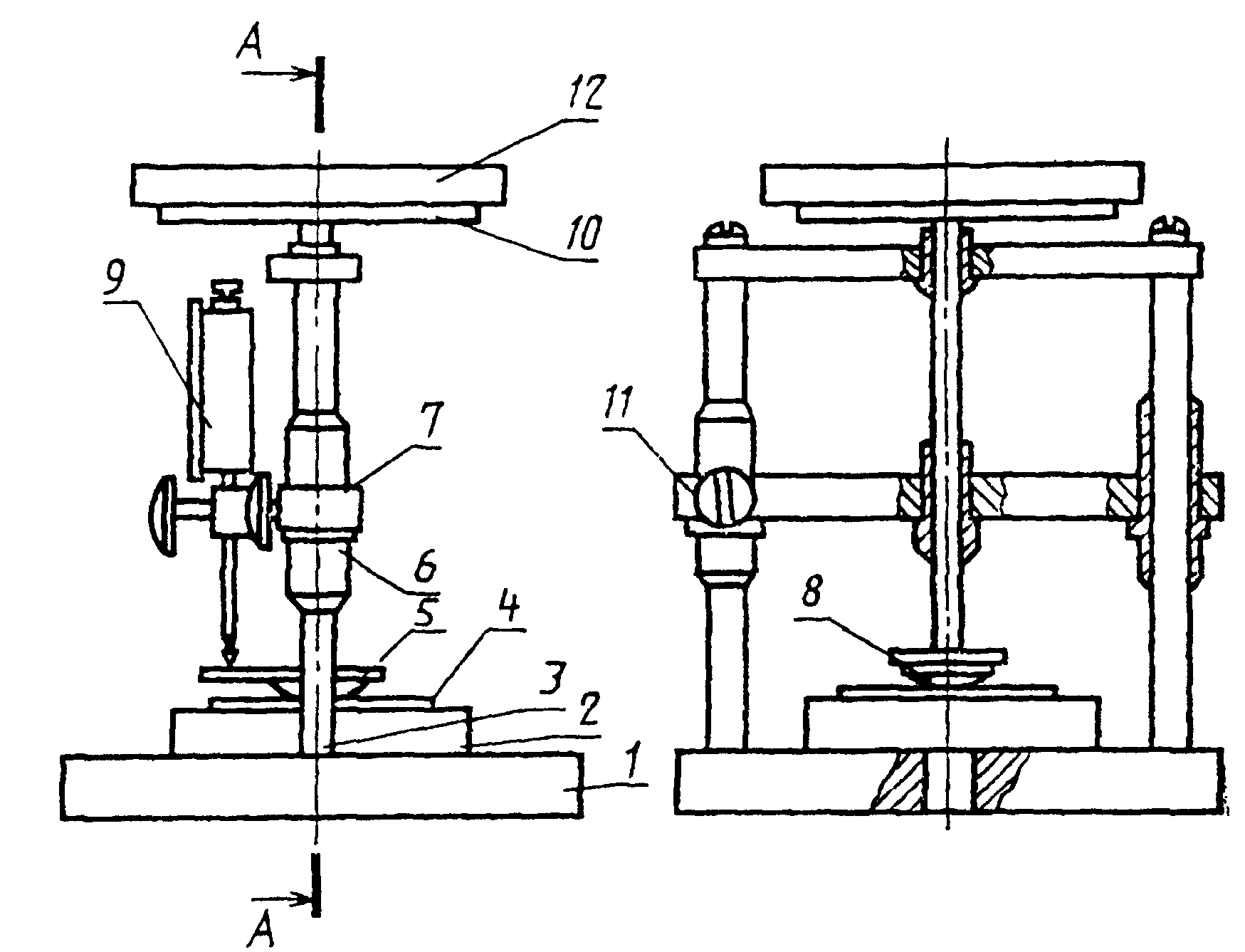 1 - основание; 2 - столик; 3 - шток; 4 - образец; 5 -