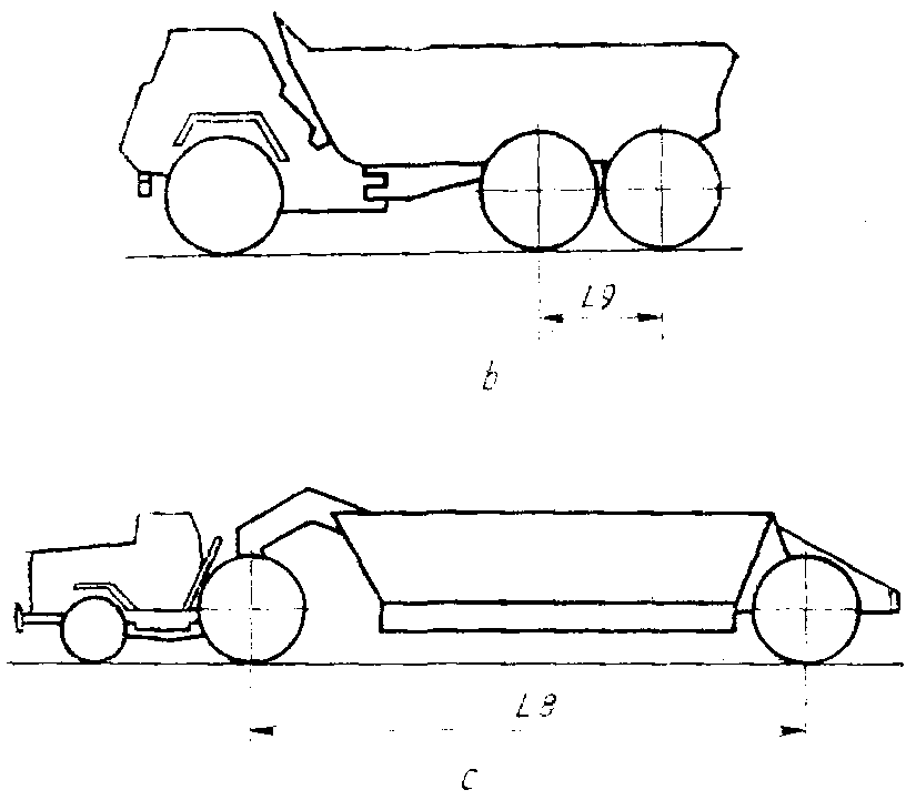 со сдвоенным задним мостом; c - полуприцепной землевоз