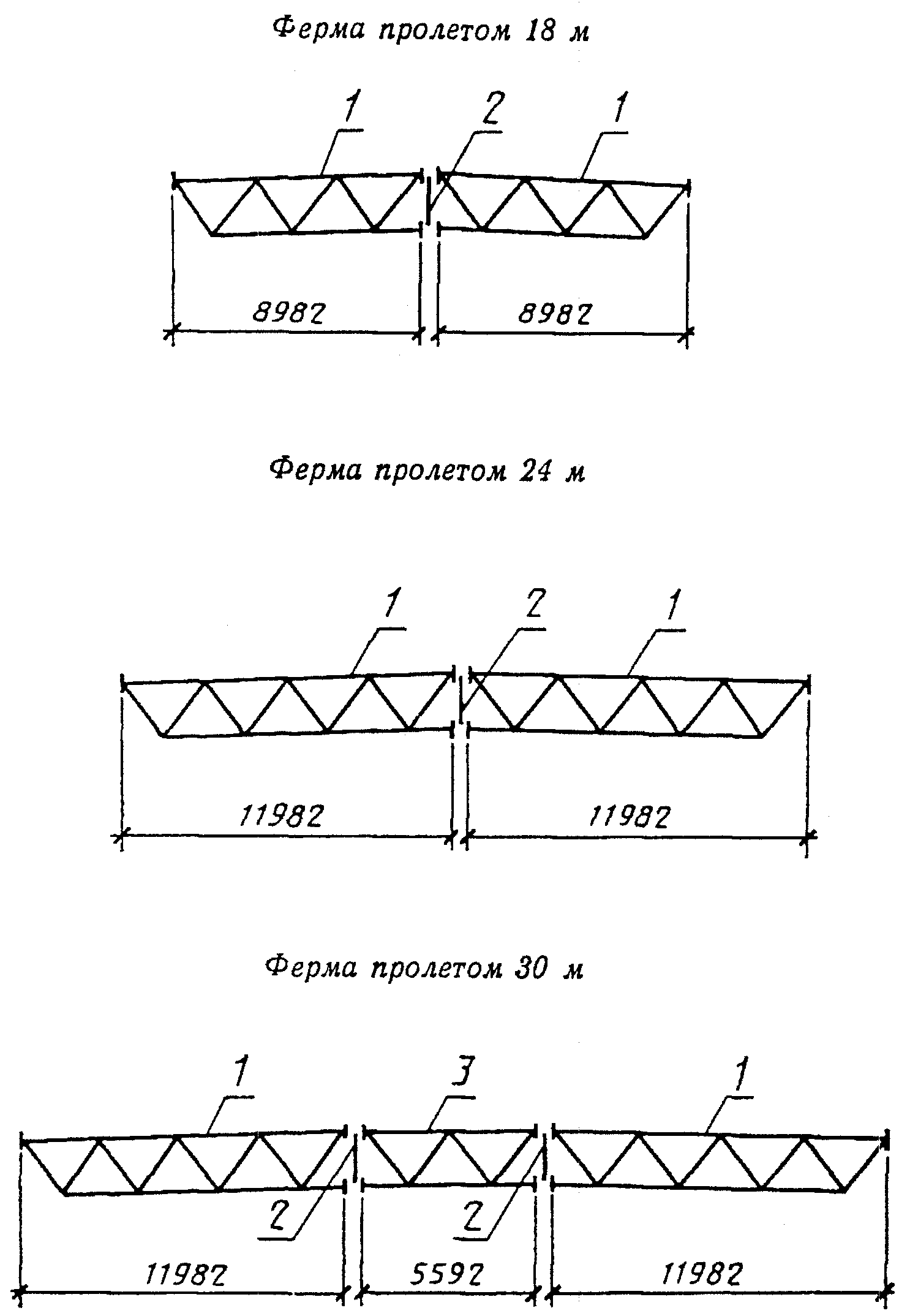 1.2.3. Фермы состоят из отправочных элементов (полуферм, средней части и стоек), соответствующих указанным на черт. 2.
