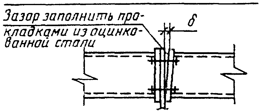 5.4. Зазоры в опорных узлах ферм необходимо заполнять стальными прокладками толщиной 4, 6 и 8 мм, а во фланцевых соединениях ферм - прокладками из оцинкованной стали по