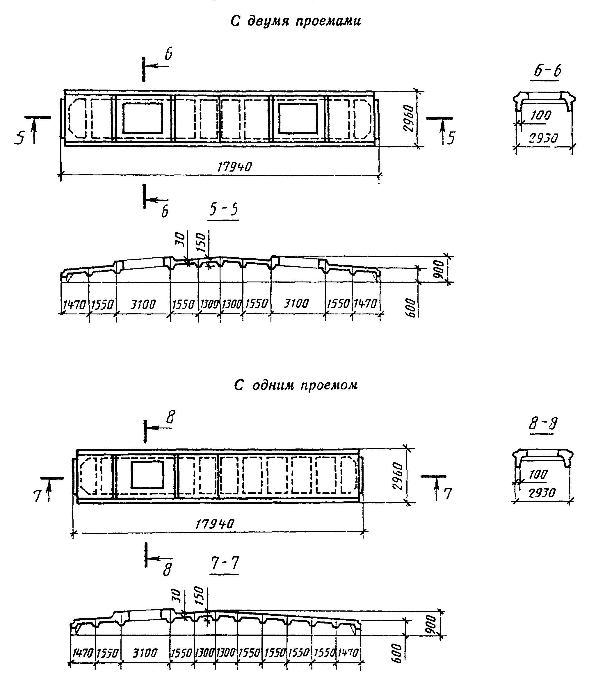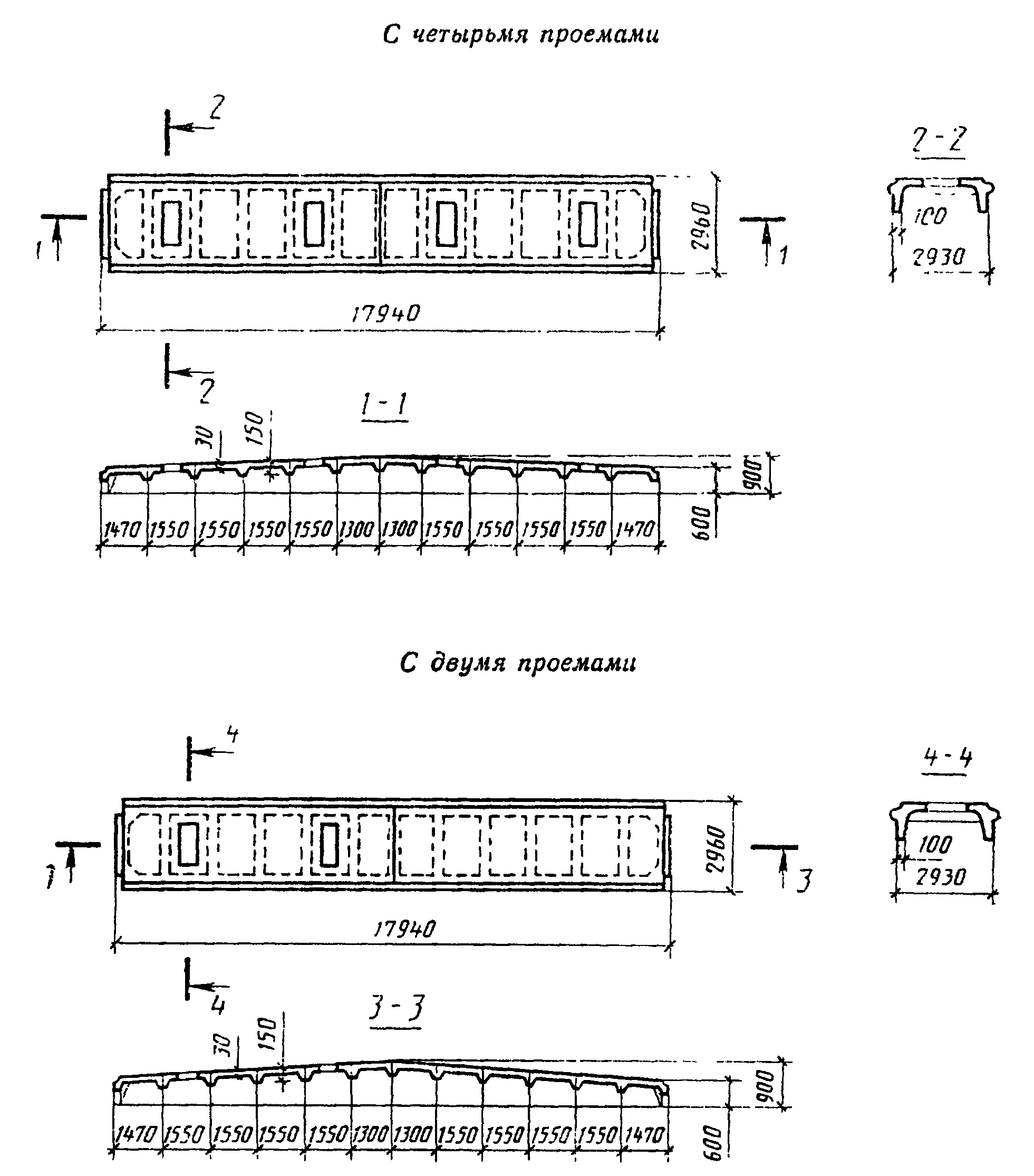 ПС - с проемами в полке плиты для установки светоаэрационных фонарей, с верхней плоской (горизонтальной или двускатной) поверхностью;