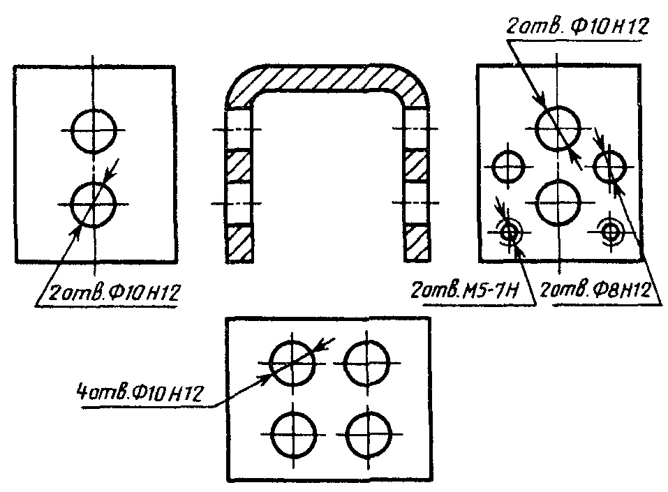На строительных чертежах допускается одинаковые группы отверстий обводить сплошной тонкой линией с поясняющей надписью.