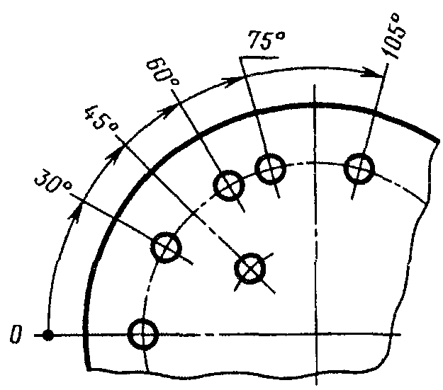1.13. При расположении элементов предмета (отверстий, пазов, зубьев и т.п.) на одной оси или на одной окружности размеры, определяющие их взаимное расположение, наносят следующими способами: