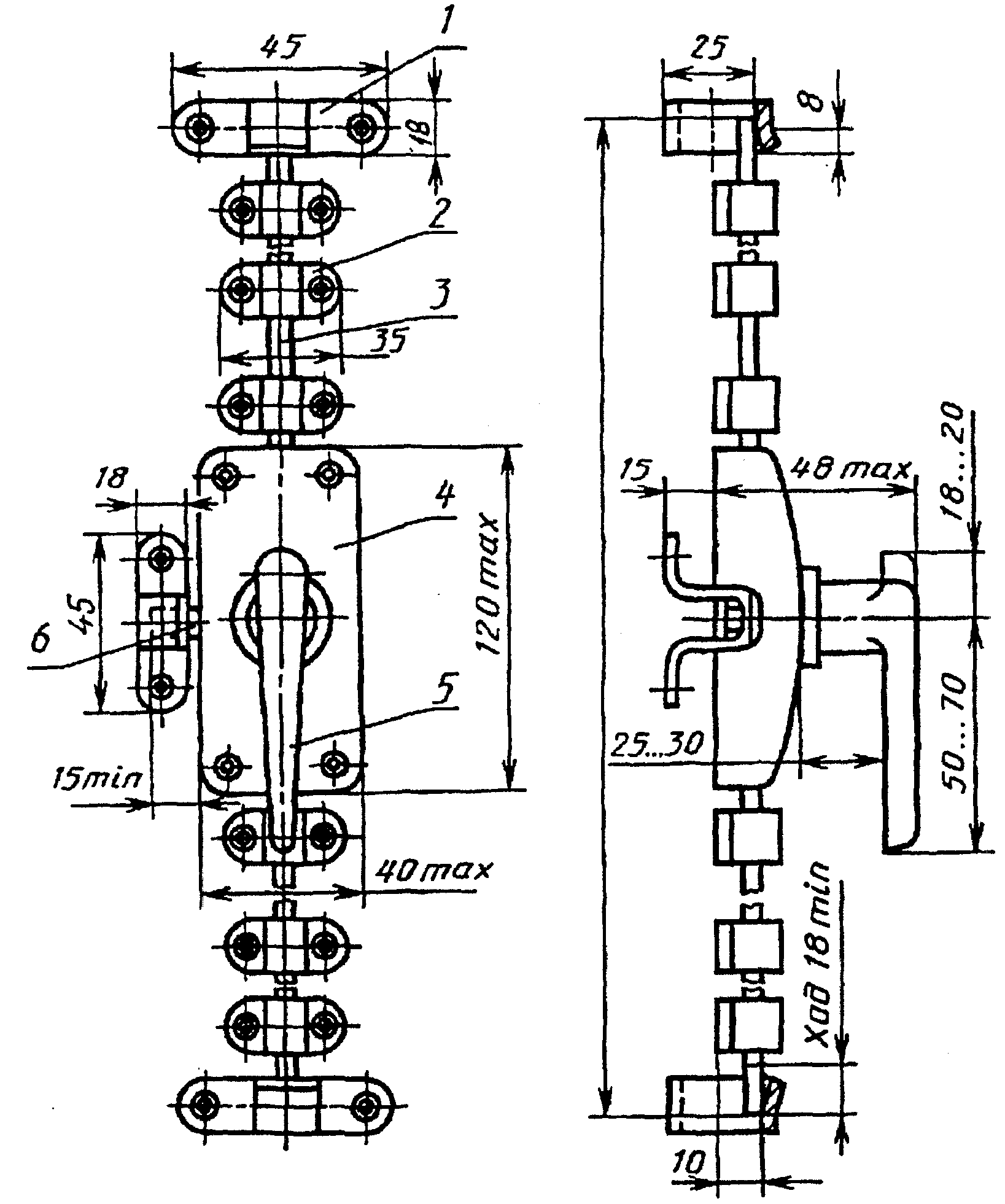 6. Засовы врезных шпингалетов и заверток в открытом положении не должны выступать над лицевой поверхностью планок или западать внутрь корпуса более чем на 1 мм.
