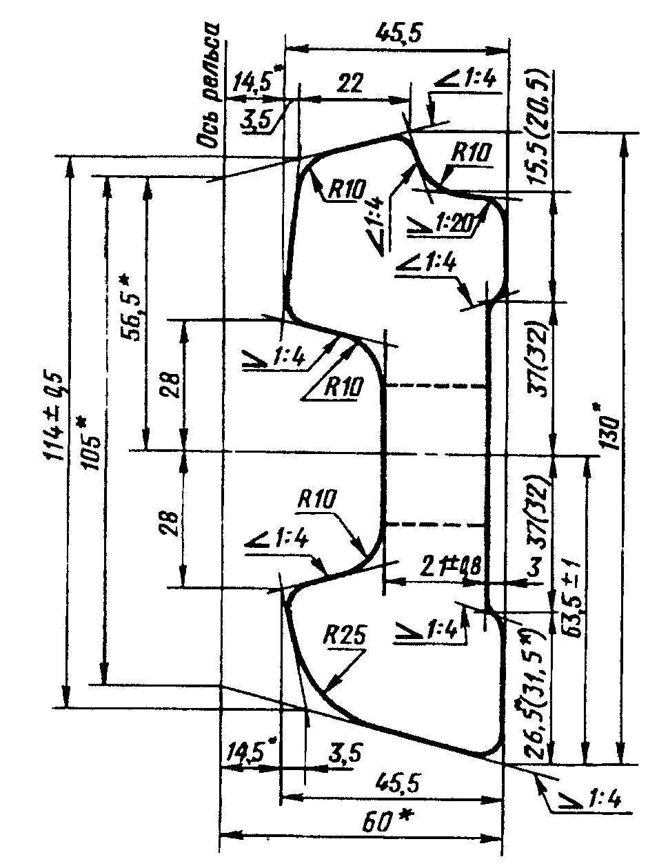 2. В скобках указаны конструктивные расчетные данные для накладок, изготовляемых на нереконструированных прокатных станах.