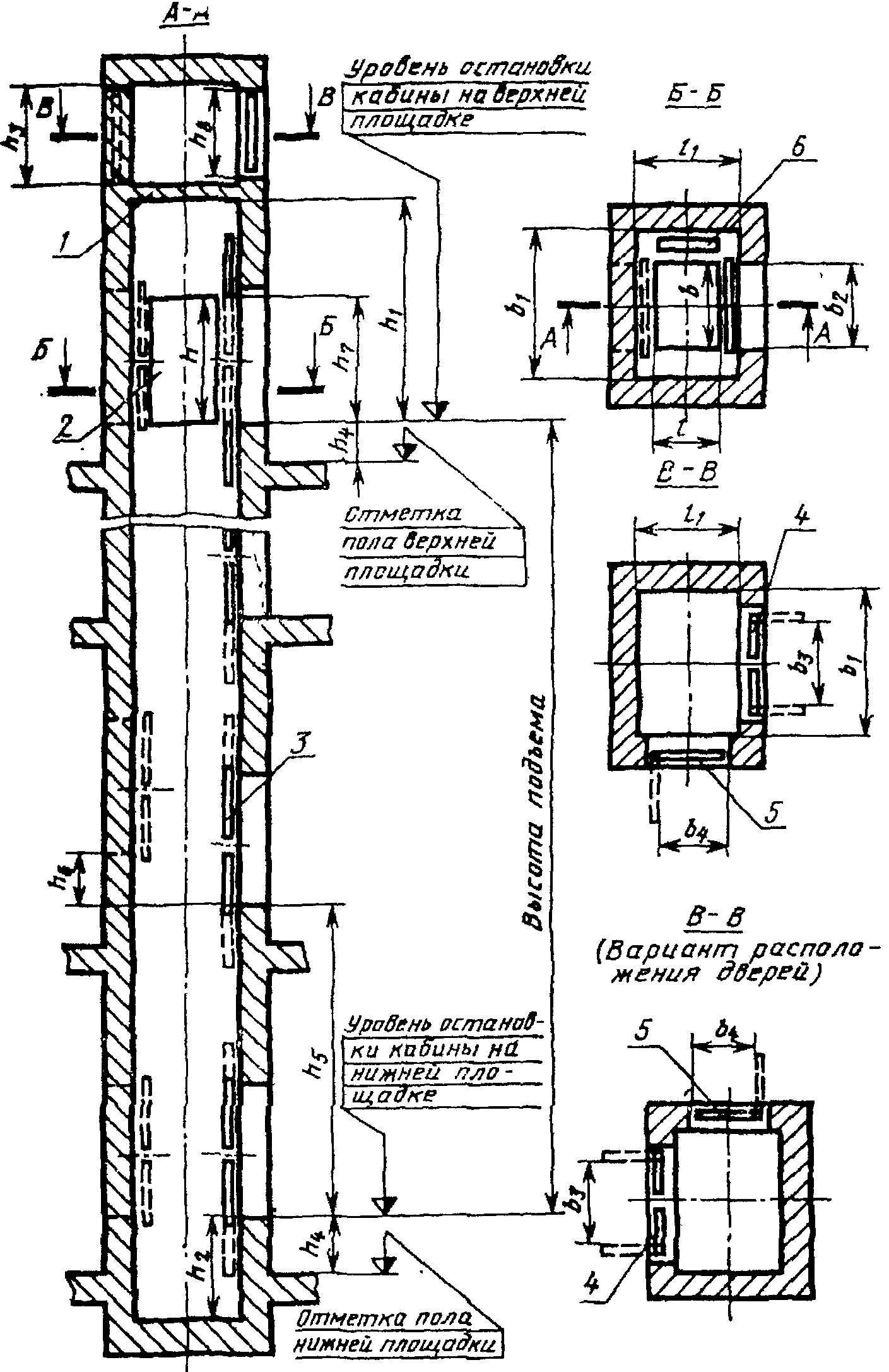 1 - перекрытие шахты; 2 - кабина; 3 - дверь шахты;