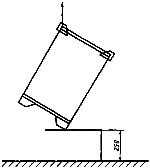 п. 5.1, подвешивают в ненагруженном состоянии так, чтобы диагональ корпуса поддона была вертикальной и наиболее низкая часть поддона (стойка или ножка) была удалена на 250 мм (черт. 4) от ровной бетонной плиты прочностью 16 МПа. Затем поддон опускают, чтобы он мог свободно падать на угол стойки (ножки). Испытание проводят 4 раза, чтобы каждый раз поддон падал на угол другой стойки (ножки). После проведения испытания проводят тщательный визуальный осмотр поддона и измерение размеров.