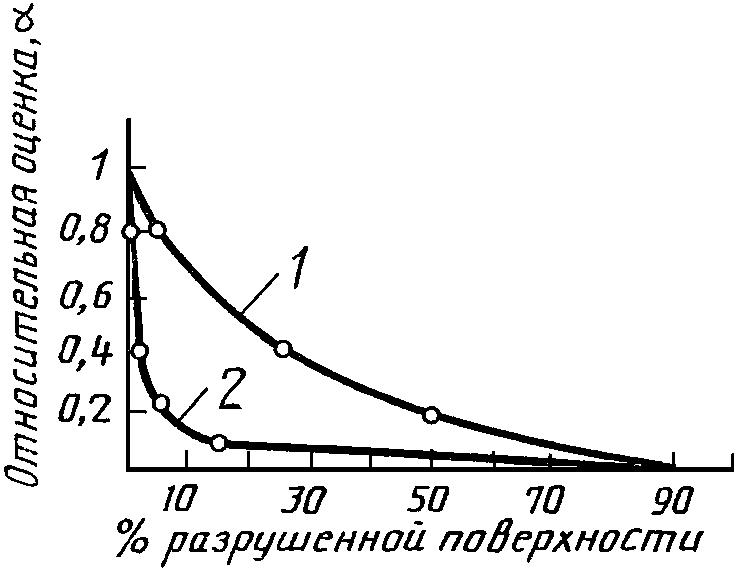 Для определения более точных относительных оценок отдельных видов разрушения рекомендуется пользоваться калибровочными кривыми (см. чертеж); для растрескивания, отслаивания, выветривания, сморщивания, образования пузырей, растворения - кривая 1, для коррозии металла - кривая 2.