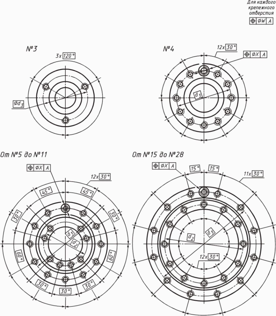 1 - с крепежными отверстиями, расположенными на делительных окружностях диаметров d2 и d3;
