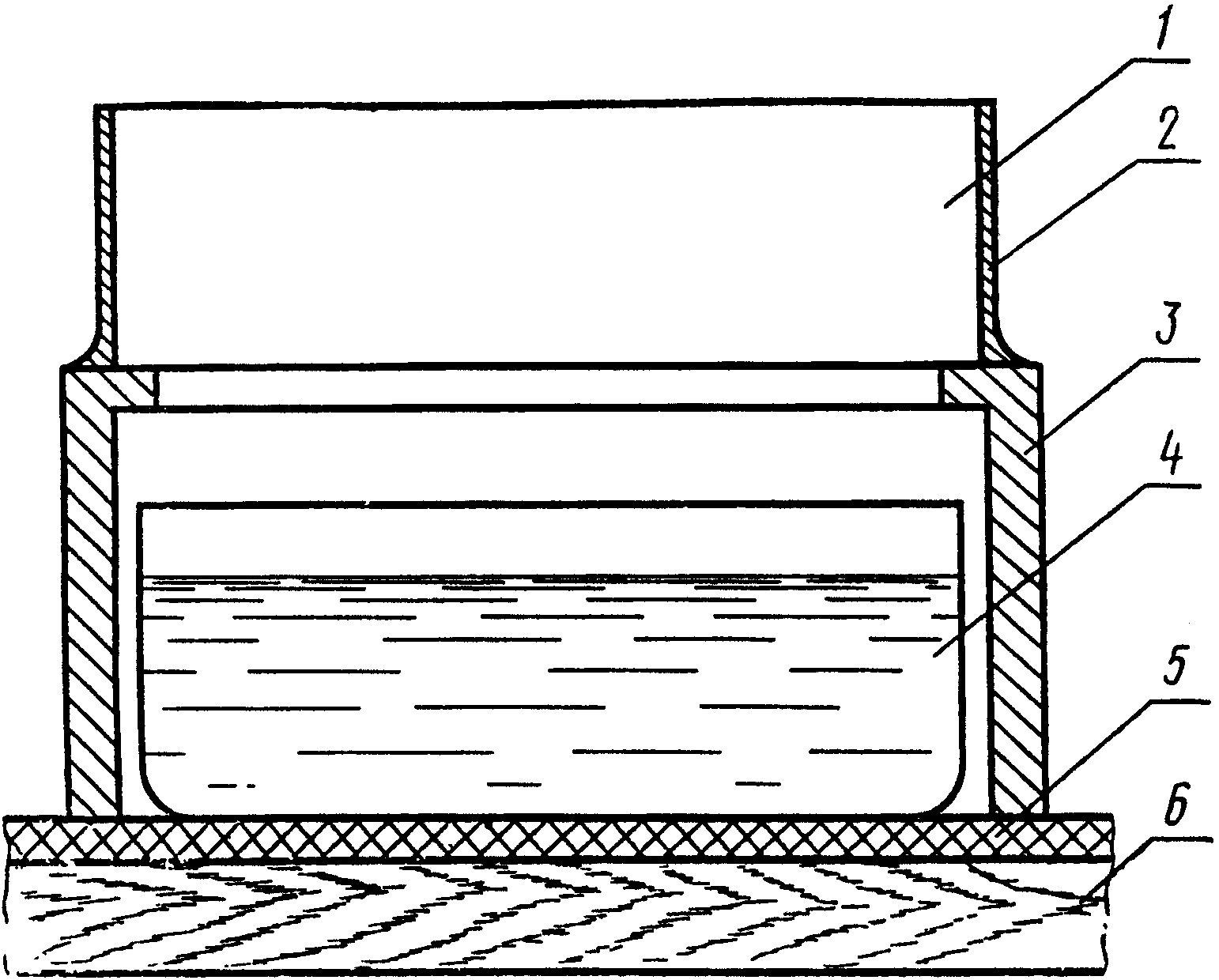 4.4. В каждую металлическую трубу под образец устанавливают стеклянную чашку с насыщенным раствором сернокислого калия, создающим под образцом относительную влажность воздуха 97%. В чашку наливают такое количество раствора, чтобы расстояние от уровня раствора до нижнего основания образца равнялось 25 мм.