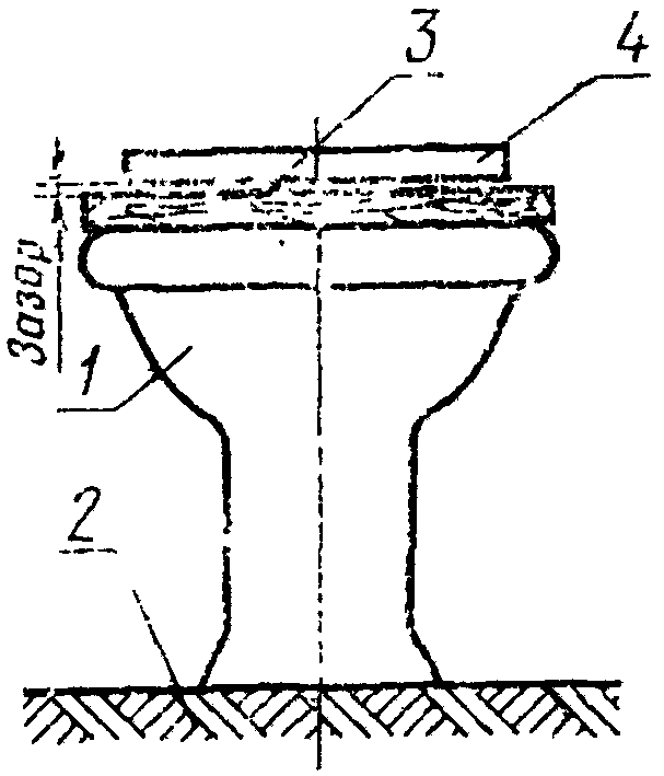 1.3. Горизонтальность верхней поверхности изделий проверяют в соответствии с черт. 2. Унитаз (биде, чашу унитаза) 1 устанавливают на горизонтальную поверхность 2 и сверху на него накладывают деревянную плиту 3, закрывающую всю поверхность изделия. На плиту устанавливают уровень 4 и калибром (щупом) измеряют зазор между верхней поверхностью плиты и нижней поверхностью горизонтально установленного на ней уровня.