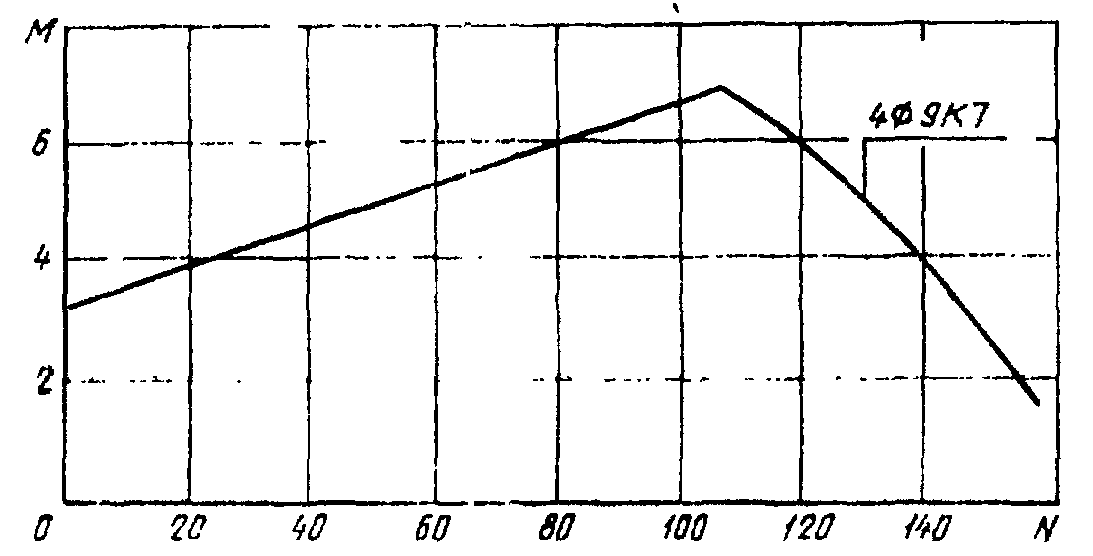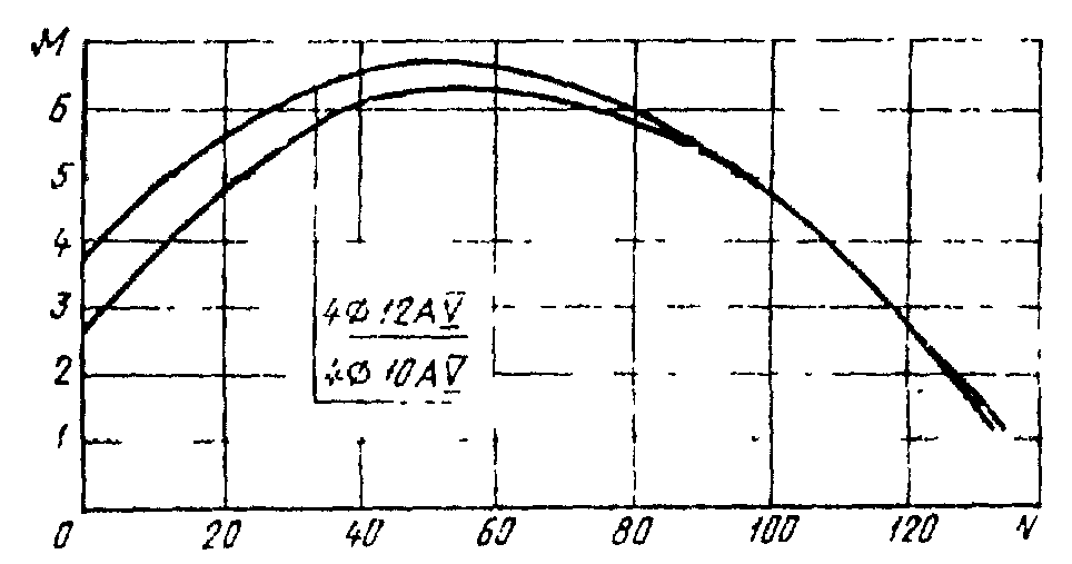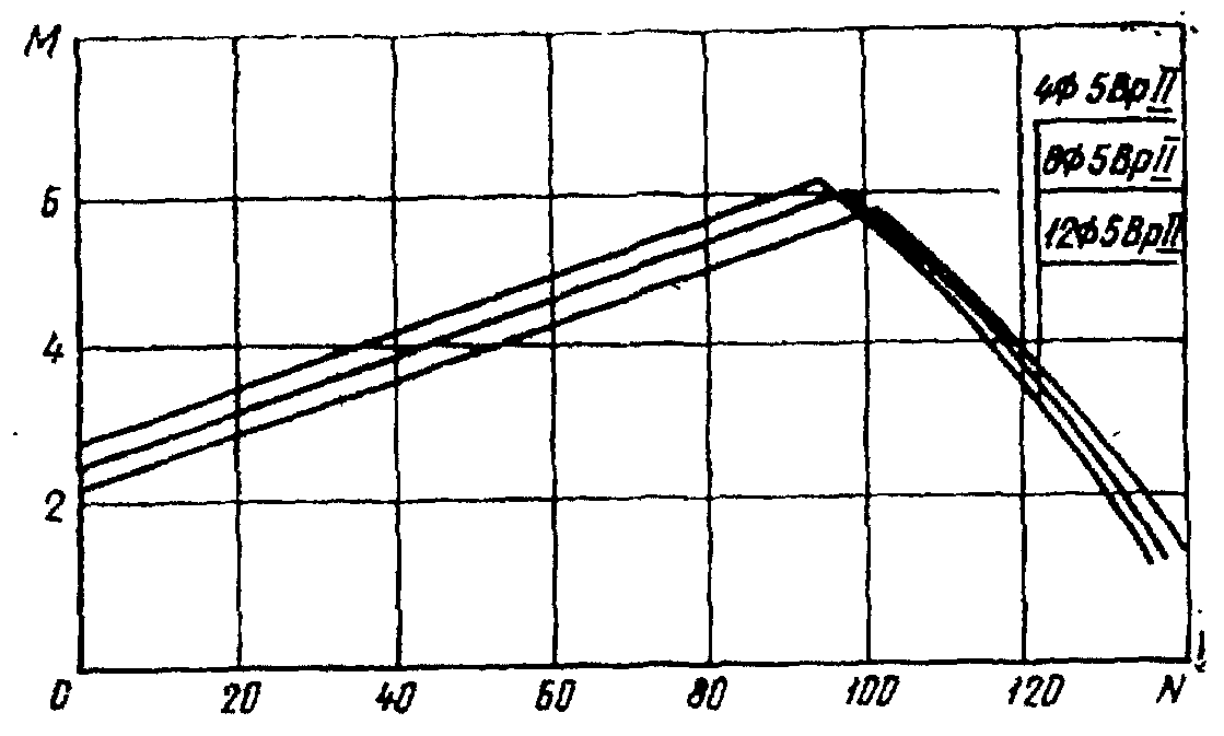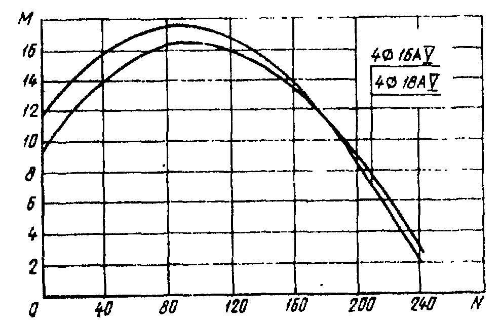7. Если точка с координатами M и N лежит ниже линии, соответствующей принятому армированию свай, то выбранная свая удовлетворяет расчету по прочности, раскрытию или образованию трещин (для соответствующей продольной арматуры) на эксплуатационные нагрузки M и N, если точка лежит выше - не удовлетворяет.