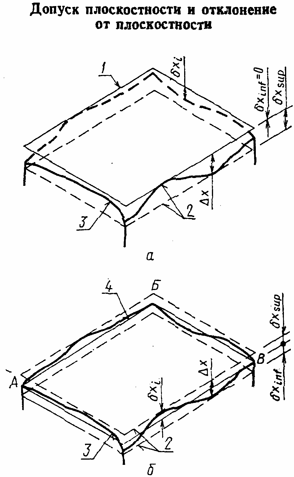 а - допуск плоскостности и отклонение от плоскостности при