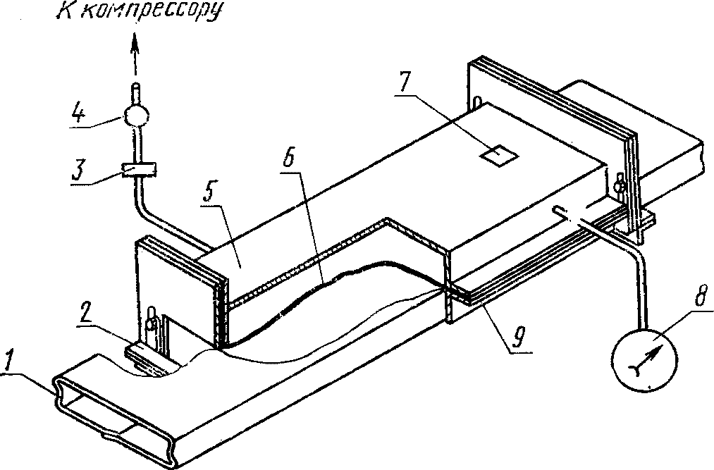 Образец 1 укладывают на опоры 2, имеющие резиновые прокладки толщиной не менее 10 мм, вплотную к мембране 6. Швеллерное или ребристое стекло укладывают ребрами вниз, а коробчатое швом вниз. Открывают вентиль 4 для подачи воздуха и создания избыточного давления в полости короба 5.