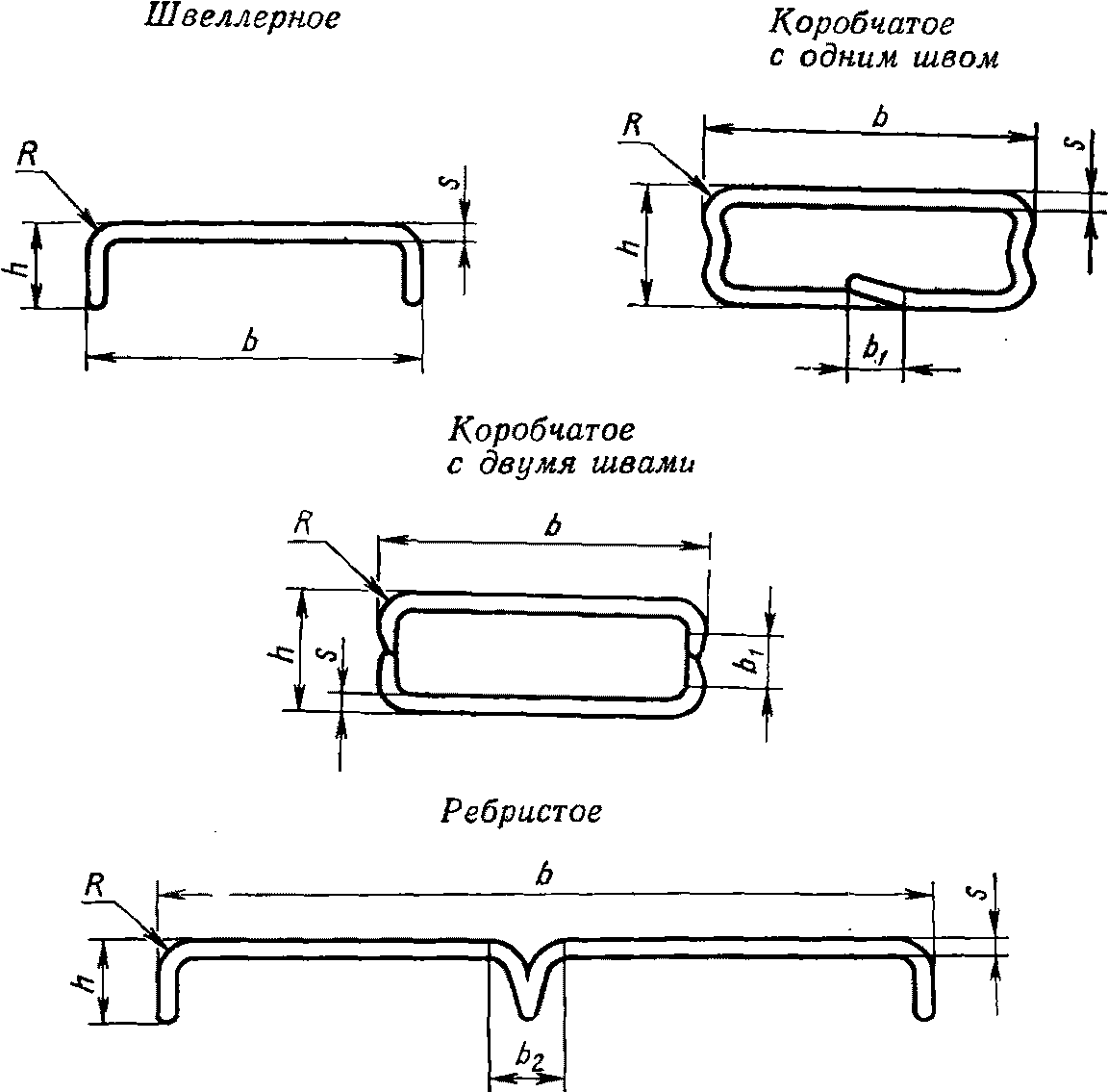 Тип | Марка | Ширина b | Высота h | Толщина S | Длина, не более | Ширина шва b1 | Наружный радиус углов R | Ширина основания среднего ребра b2 |