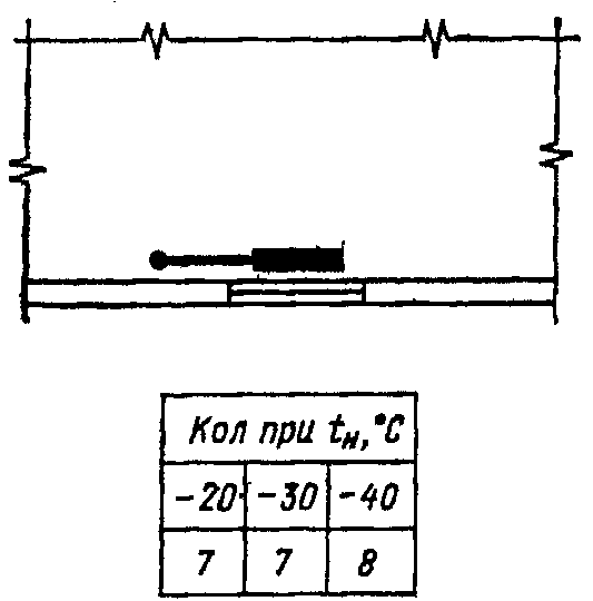 В типовых проектах зданий (сооружений) для двух и более расчетных температур наружного воздуха диаметры трубопроводов, при необходимости, указывают в таблице. При наличии на чертеже нескольких таблиц допускается наименование граф приводить только на одной из них, а также исключать отдельные графы повторяющихся показателей (черт. 6).