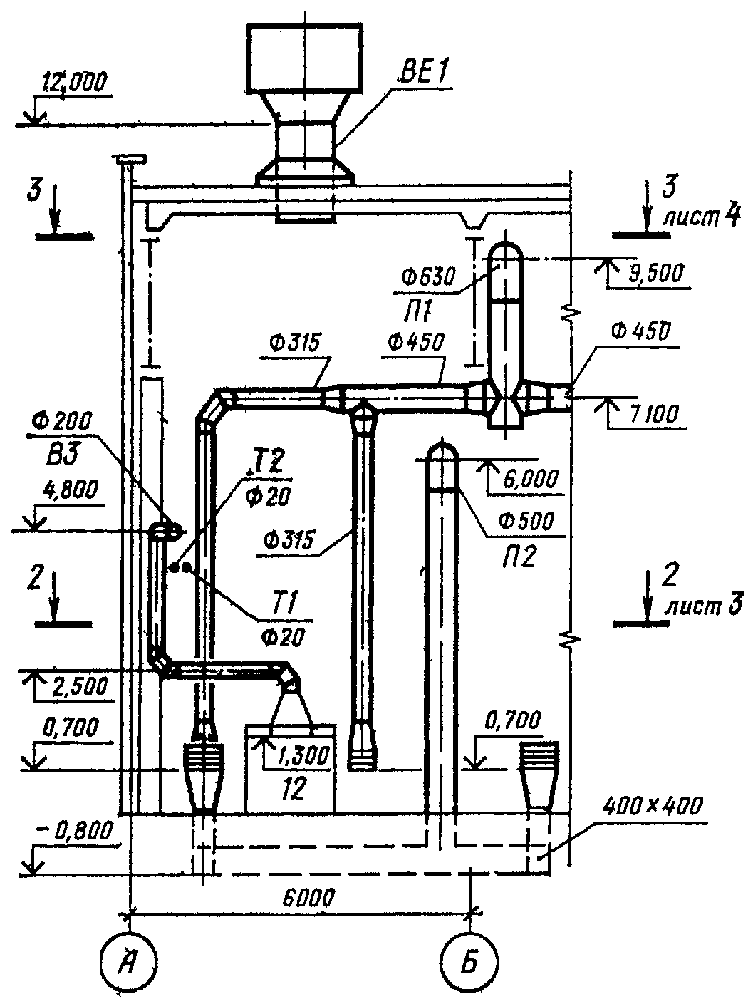 отметки уровня оси круглых и низа прямоугольных воздуховодов;