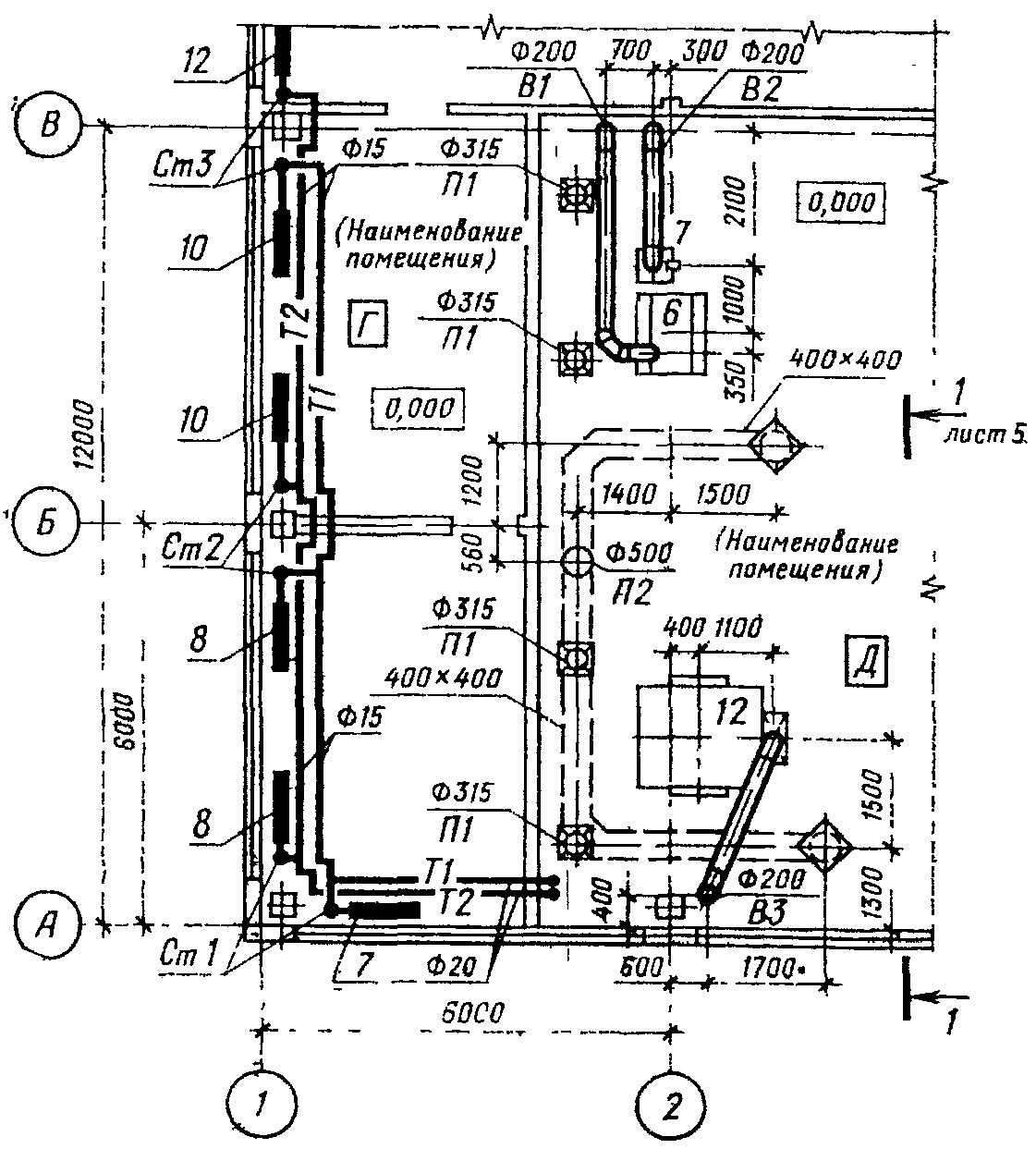При выполнении части плана систем в наименовании указывают оси, ограничивающие эту часть плана, например: "План на отм. 0,000 между осями 1-8 и А-Д".