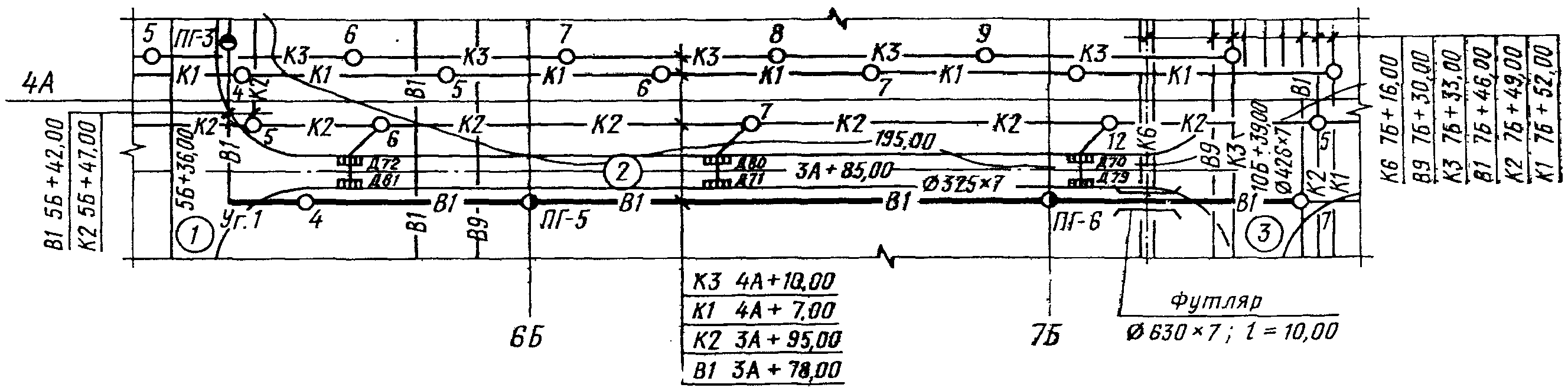 футляры на трубопроводах с указанием диаметров, длин и привязок их к оси дорог или проектируемым сетям и сооружениям.