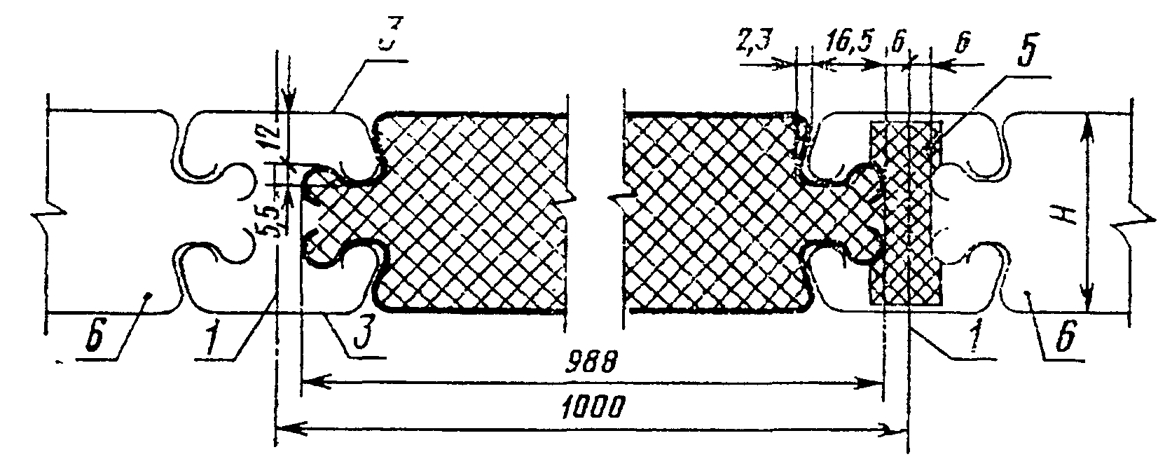 3 - панели с разными продольными кромками - одна в виде паза, другая в виде гребня, несимметричными по толщине панели, которые образуют стыки в шпунт.