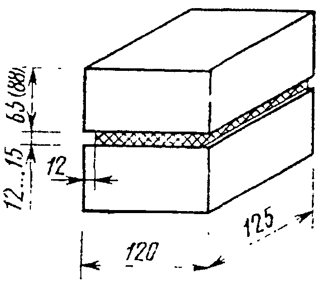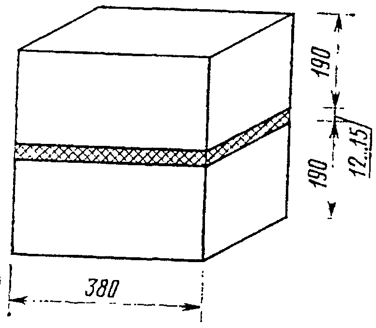 Пластинки изготавливают в виде квадрата, сторона которого в 1,5 раза должна превышать толщину пластинки, равную толщине шва. Склеивание пластинок раствора для получения кубов с ребрами 3 - 4 см и выравнивание их поверхностей производят при помощи тонкого слоя гипсового теста (1 - 2 мм). Прочность раствора должна определяться как среднее арифметическое результатов испытаний пяти образцов.