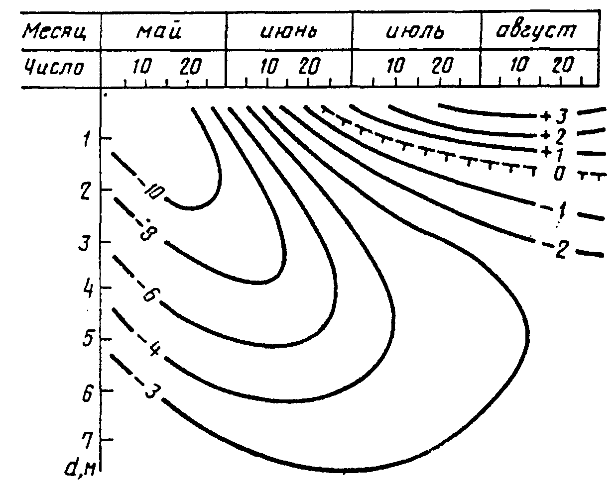 График распределения температуры t, °C, грунта по длине d,