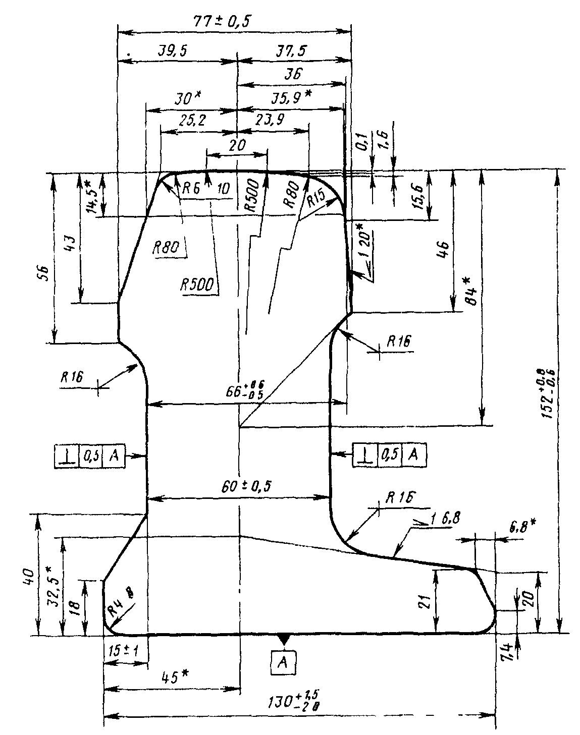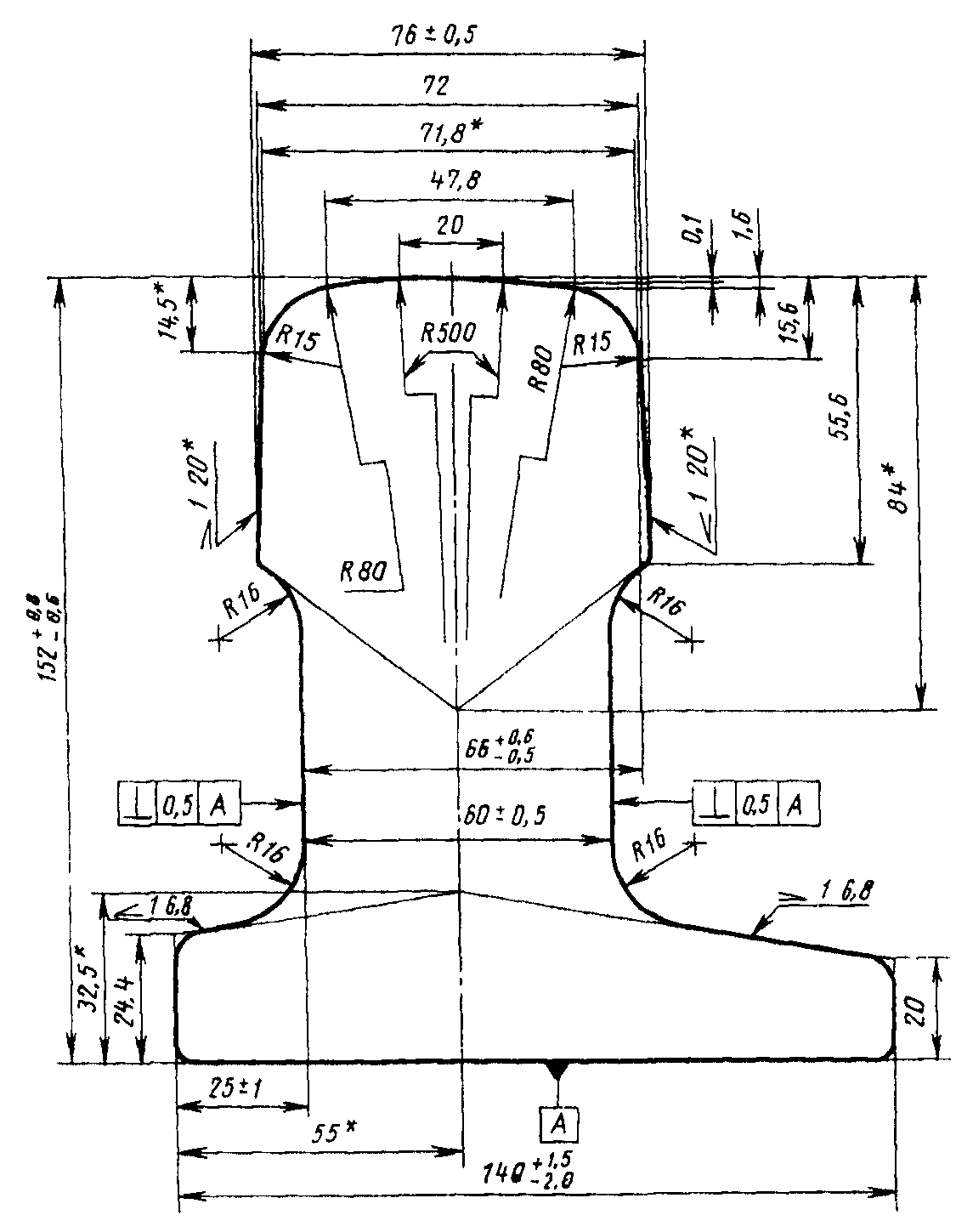 <*> Теоретическая масса рельса определена исходя из номинальных размеров их поперечного сечения и плотности стали 7830 кг/м3.