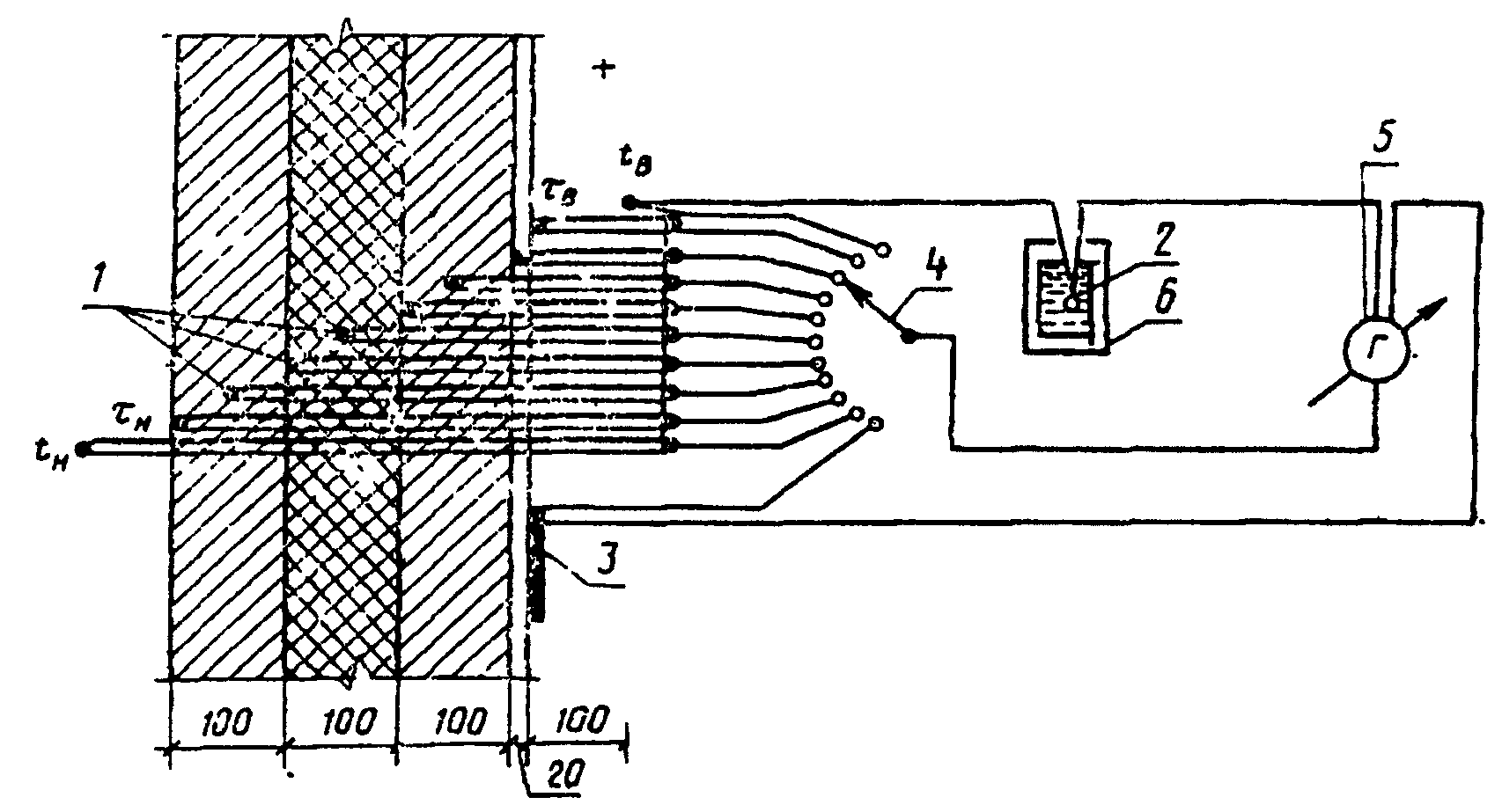 4.5. Первичные преобразователи температур и тепловых потоков располагают в соответствии со схемой. Пример схемы размещения термопар по сечению и на поверхности ограждающей конструкции и подключения их к измерительной аппаратуре приведен в справочном