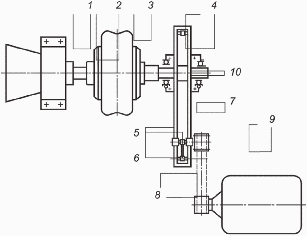 В общем случае стендовое оборудование включает в себя две стойки 1, 10, прикрепленные к фундаментным балкам. Испытуемая муфта 3 с одной стороны неподвижно крепится через фланец полумуфты и вал с наклеенными тензорезисторами 2 к стойке 1, с другой - фланец полумуфты соединен с подвижным валом, установленным в подшипниках качения, закрепленных в опорах стойки 10. К средней части подвижного вала приварен рычаг (корпус вибратора) 4, в котором установлен на подшипниках качения вал вибратора 5 со сменными грузами 6 и шкивом привода 7. Привод вала вибратора осуществляется клиноременной передачей 8 от электродвигателя 9.
