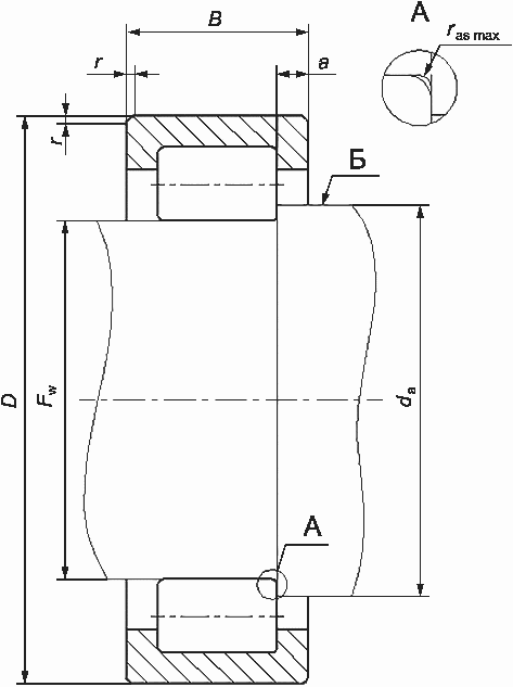 Основное условное обозначение подшипника | D | B | Fw | da | a | rs min | ras max | ||
