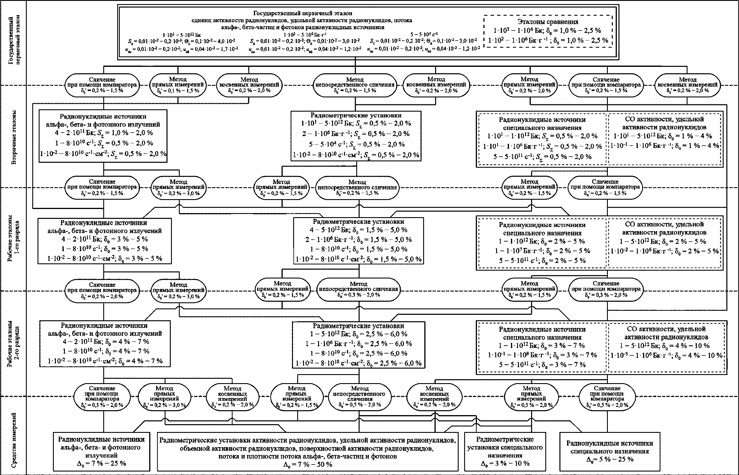 рисунок А.1 приложения А) для средств измерений активности радионуклидов, удельной активности радионуклидов, потока и плотности потока ионизирующих частиц (альфа-, бета-частиц и фотонов рентгеновского и гамма-излучений) радионуклидных источников и устанавливает основные метрологические характеристики государственного первичного эталона и порядок передачи единиц: