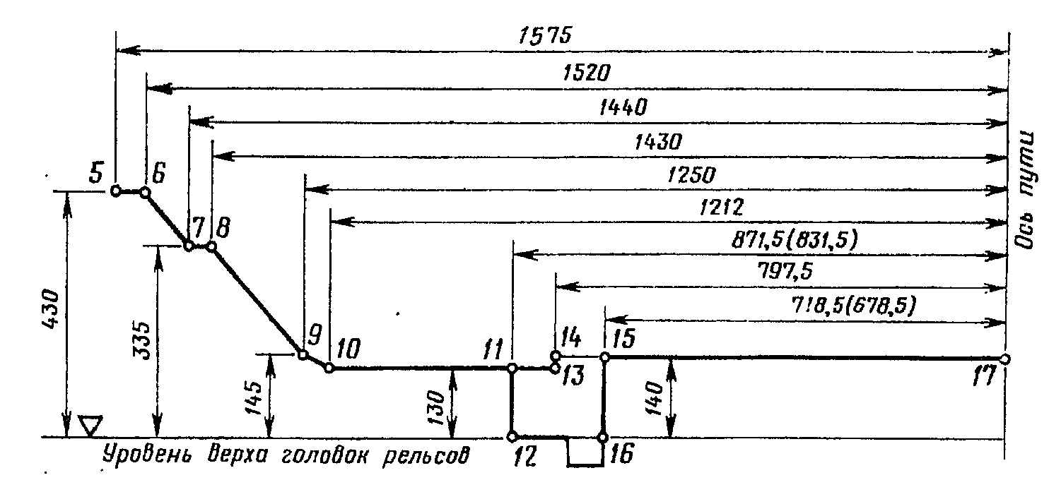 Для каждой выступающей точки, вписываемой в габарит части подвижного состава, должны быть указаны координаты: горизонтальная - от продольной вертикальной серединной плоскости подвижного состава; вертикальная - от уровня верха головок рельсов.