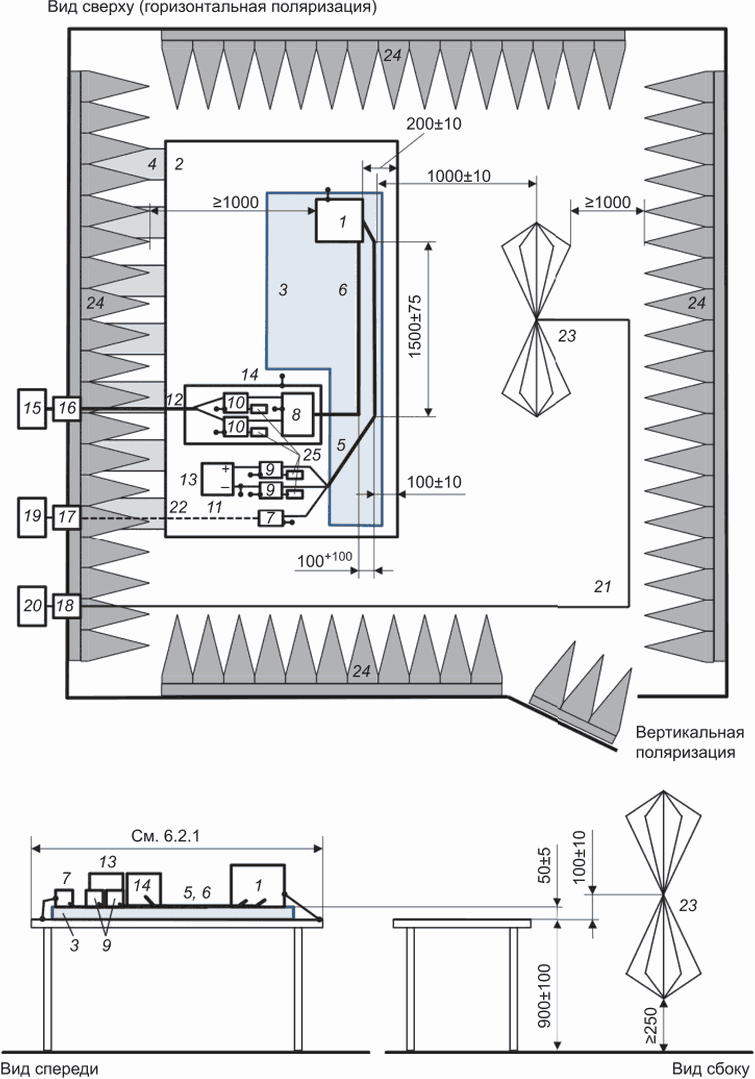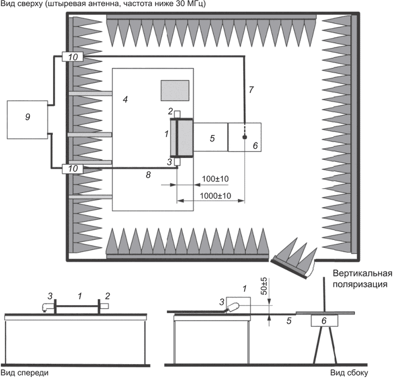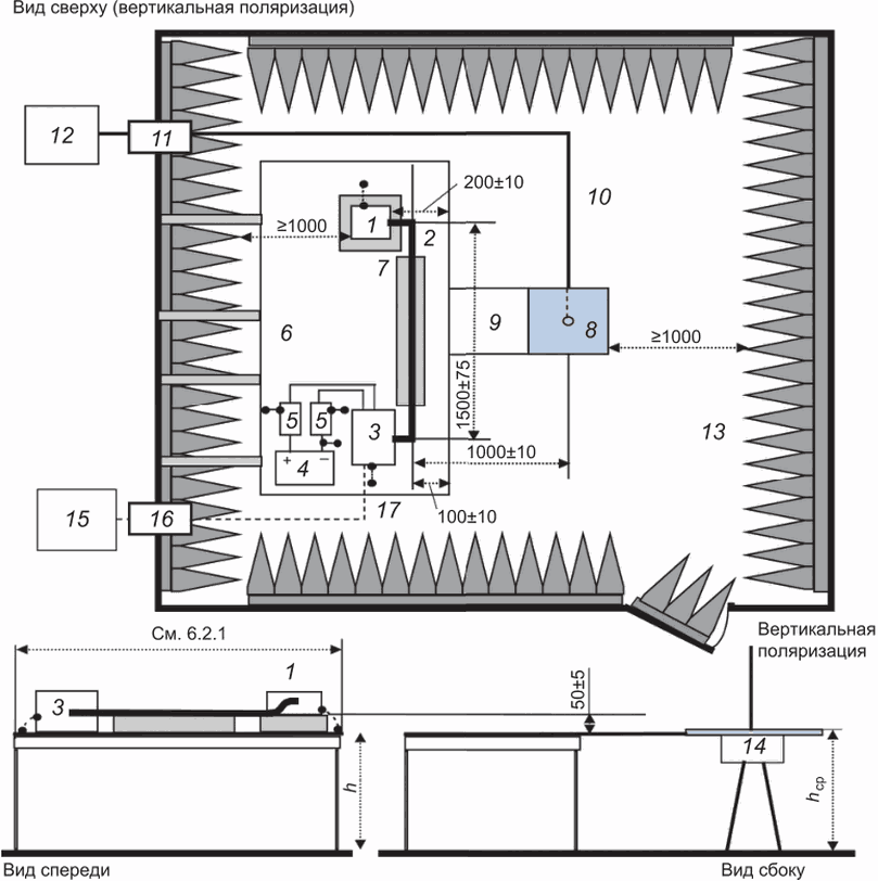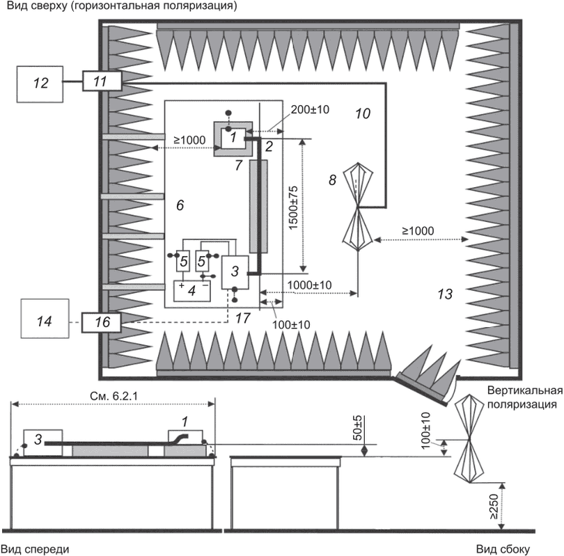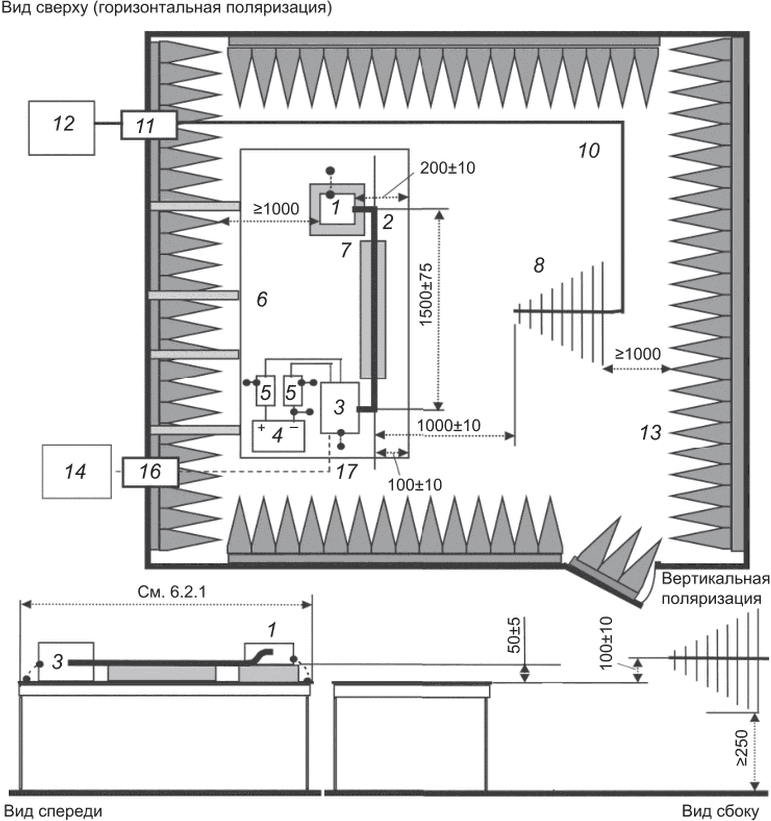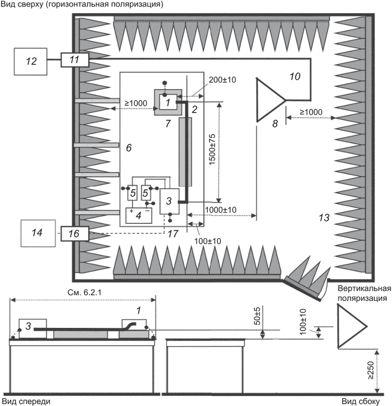 <1> Согласно CISPR 16-4-2. <2> Согласно CISPR 16-4-2 (используются значения, предлагаемые для разных частотных полос от 150 кГц до 6 ГГц). <3> Значение +/- 0,5 дБ применяют, если затухание кабеля(ей) измерительной системы, предусилителя, адаптера полного сопротивления и проходного разъема измеряются одновременно. Если затухание кабеля(ей) и проходного разъема измеряют отдельно, значение +/- 0,5 дБ необходимо удвоить. <4> Значение +/- 0,25 дБ применяют, если частотная интерполяция кабеля(ей) измерительной системы, предусилителя, адаптера полного сопротивления и проходного разъема измеряется одновременно. Если частотную интерполяцию кабеля(ей) и проходного разъема измеряют отдельно, значение +/- 0,25 дБ необходимо удвоить. - максимальный коэффициент отражения предусилителя равен 0,5; - максимальный коэффициент отражения входа приемника равен 0,2; - кабель не имеет потерь (|S21| = 1) и оптимально согласован (|S11| = |S22| = 0). - максимальный коэффициент отражения на входе предусилителя равен 0,32; - максимальный коэффициент отражения на выходе предусилителя равен 0,5; - максимальный коэффициент передачи от входа к выходу предусилителя |S21| = 32 дБ; - максимальный коэффициент передачи от выхода ко входу предусилителя |S12| = -40 дБ. - максимальный коэффициент отражения проходного разъема равен 0,2; - максимальный коэффициент отражения на входе предусилителя равен 0,32; - кабель не имеет потерь (|S21| = 1) и оптимально согласован (|S11| = |S22| = 0). - максимальный коэффициент отражения проходного разъема равен 0,2; - максимальный коэффициент отражения штыревой антенны равен 0,33; - кабель не имеет потерь (|S21| = 1) и оптимально согласован (|S11| = |S22| = 0). <9> Основано на том, что коэффициент калибровки антенны не зависит от высоты при калибровке в соответствии с SAE ARP 958.1. |