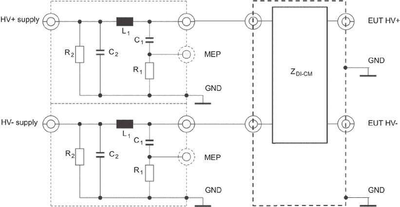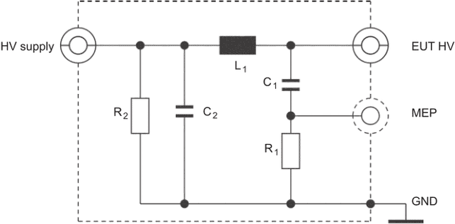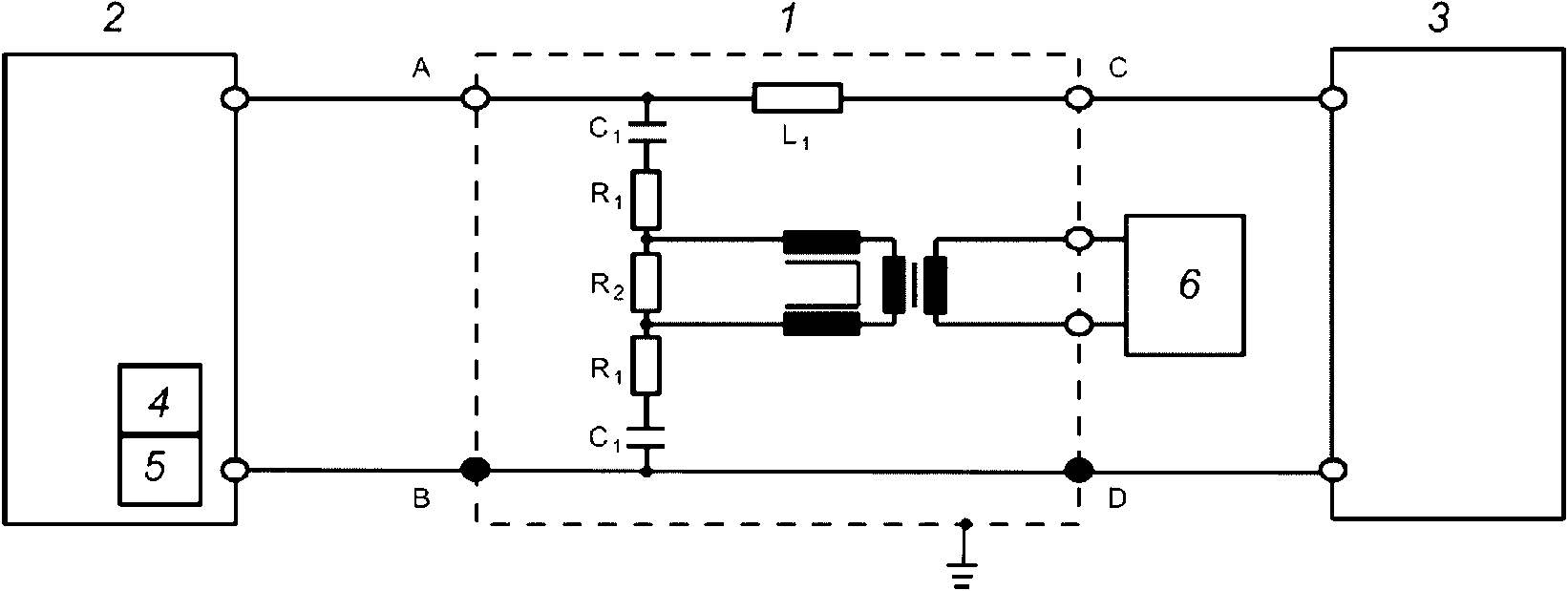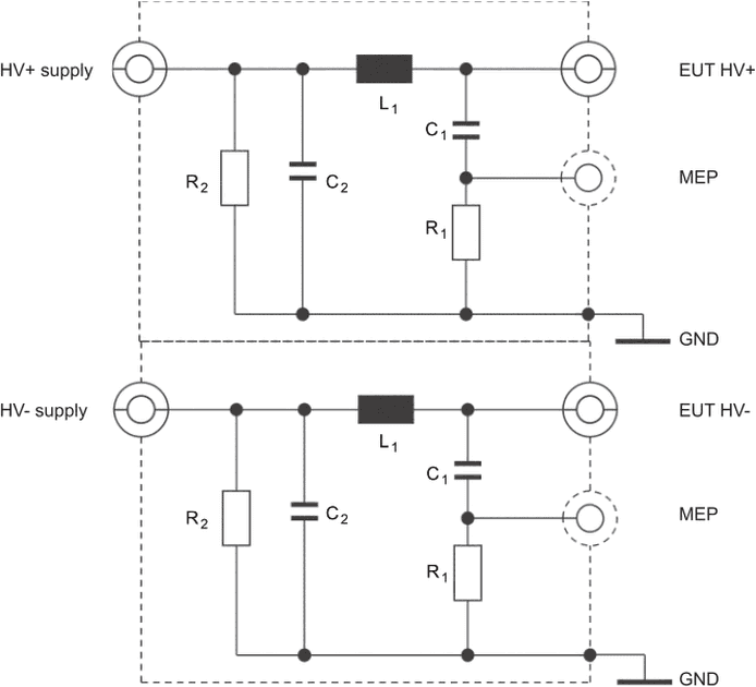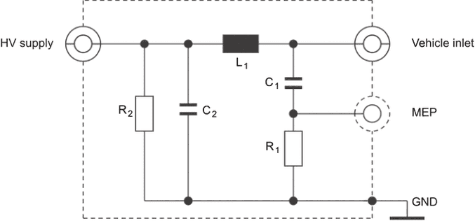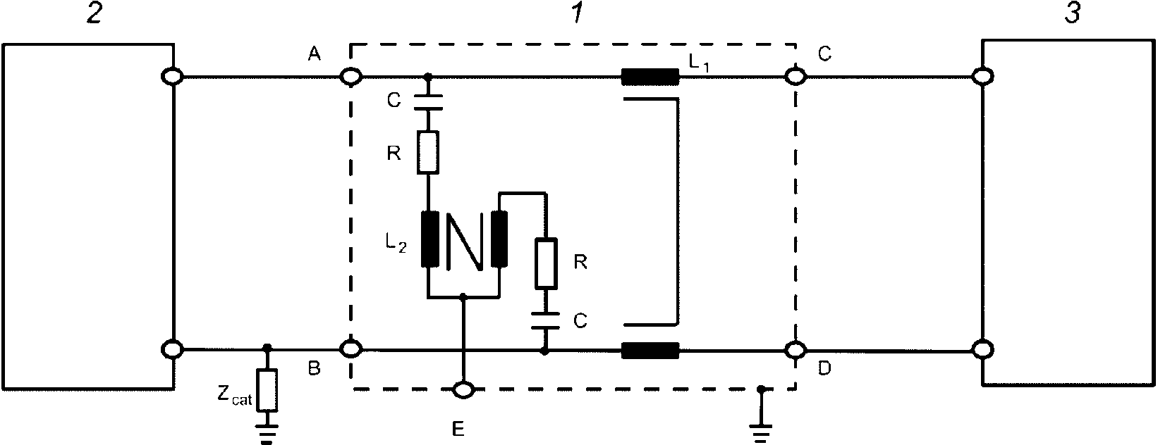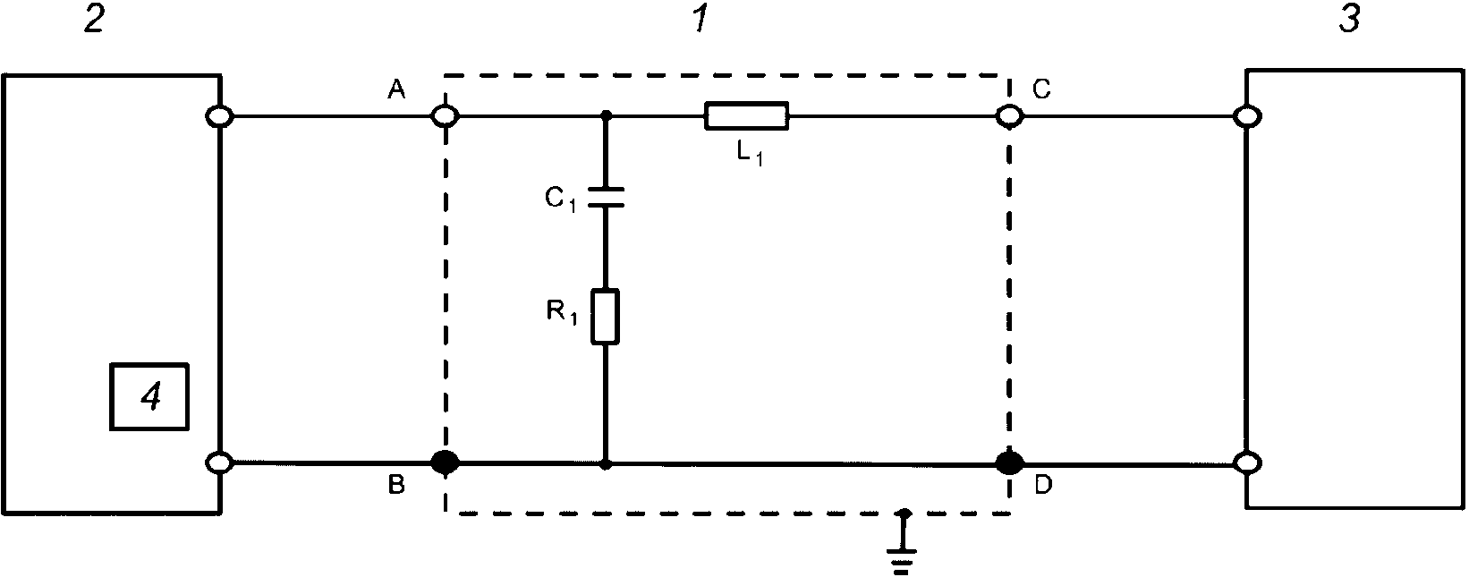 Примечание - Устройство, включаемое в линии питания постоянного тока транспортного средства в режиме зарядки, которое создает в заданной полосе частот регламентированное полное сопротивление нагрузки и которое изолирует транспортное средство от источника питания постоянного тока в этой полосе частот.