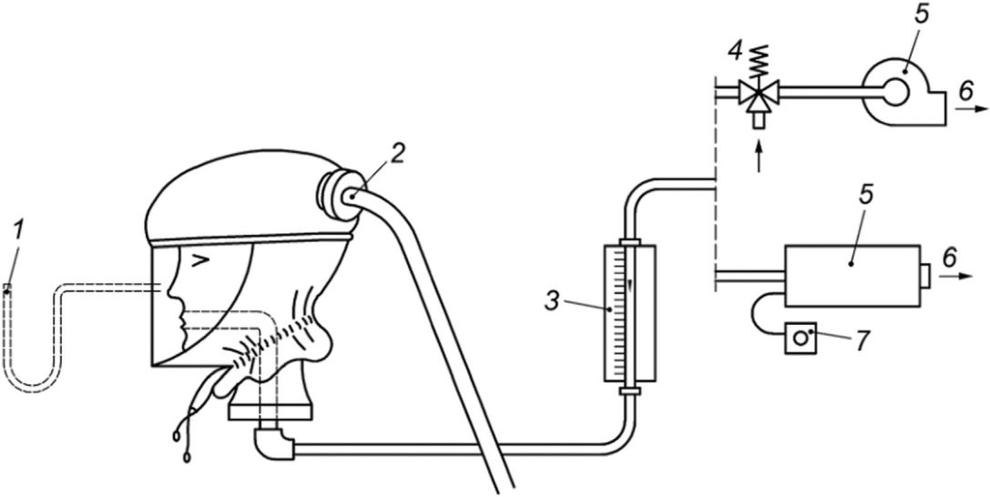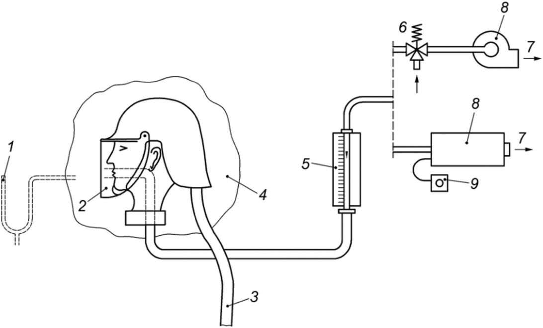3.1.5 костюм (suit): Одежда, закрывающая голову и тело пользователя, необязательно вместе со ступнями и кистями рук, оснащенная вентиляцией, при помощи которой выдыхаемый воздух и избыток воздуха полностью или частично выводятся из-под одежды в окружающую атмосферу через один или несколько клапанов выдоха.